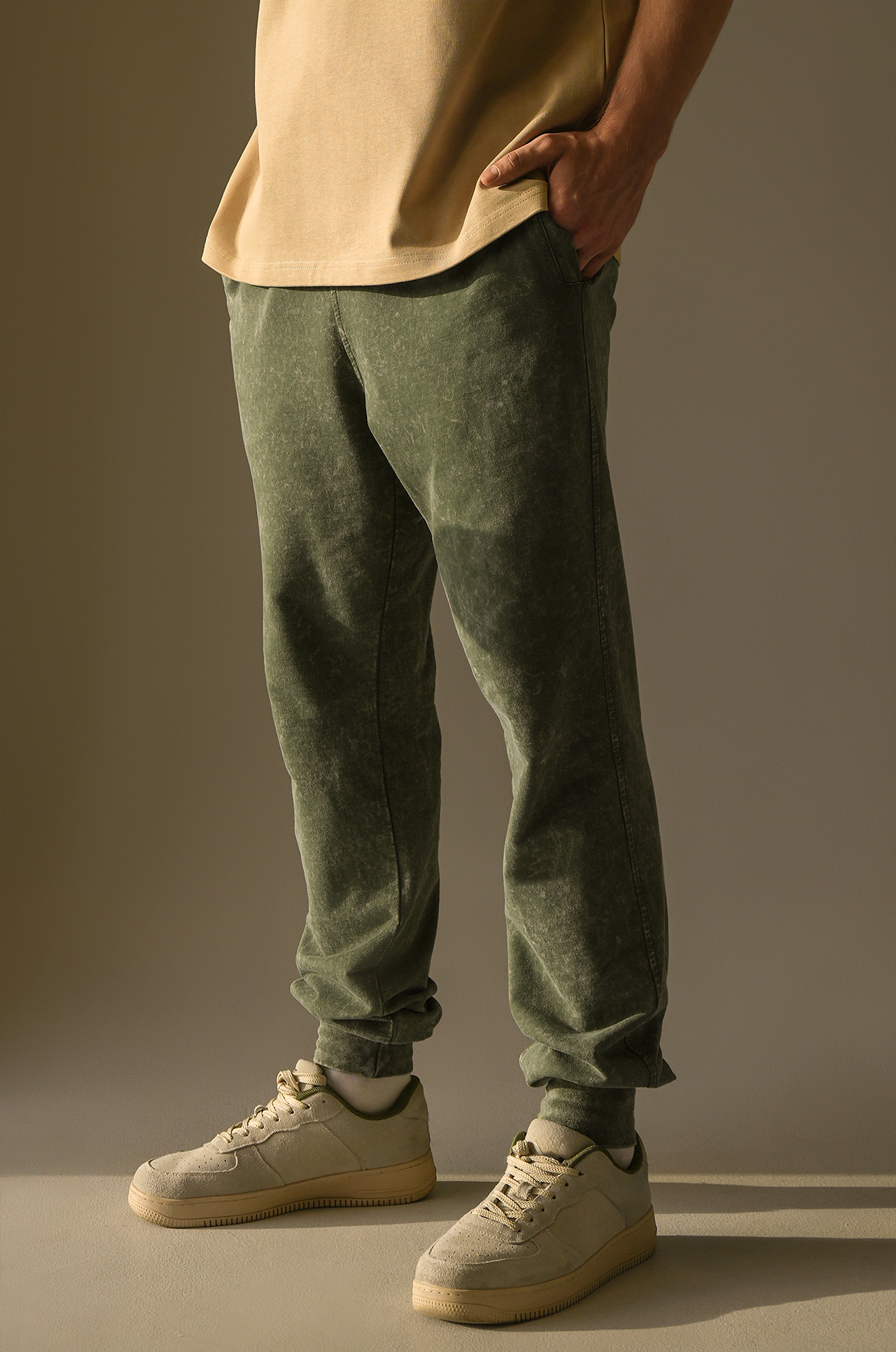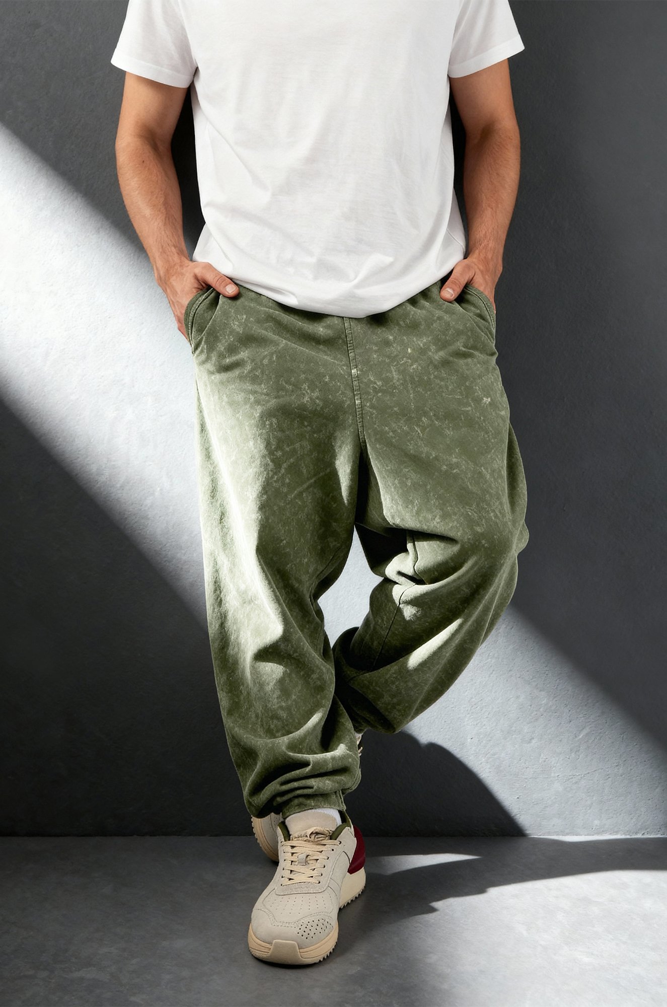Широкие мужские брюки созданы для тех, кто выбирает свободу движений и комфорт каждый день. Мягкий трикотаж (плотность 240 г/м2), свободный крой и лёгкий винтажный эффект превращают спортивные штаны цвета хаки в стильные джоггеры.