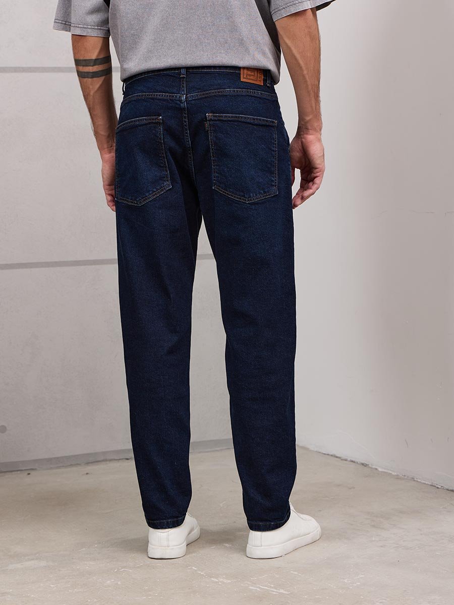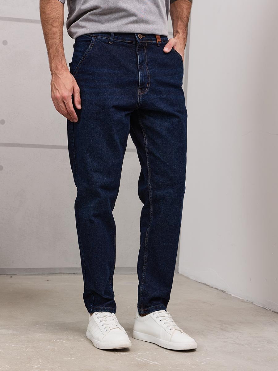 Мужские комфортные модные джинсы "Бананы" с пятью карманами.Для  удобства боковые карманы джинсов сделаны косыми , т.е.  карманы  "хулиганы".  Высокая талия, свободные по бедрам и бедру и узкие внизу. Застежка на молнии. Выполнены из слабоэластичной  ткани denim  comfort stretch. Классическая темная  стирка "stone wash" со слабовыраженными  потёртостями и "усами" спереди и потёртостями сзади.