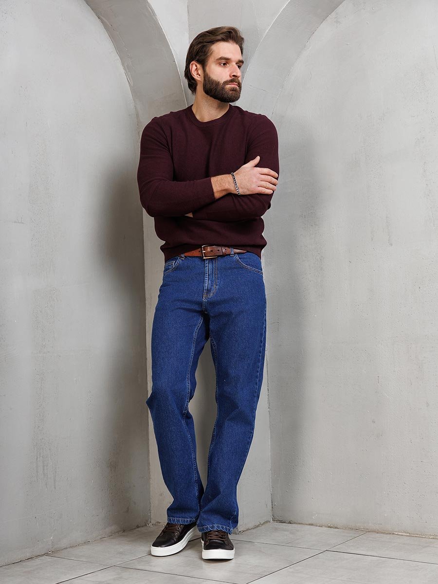 Мужские классические джинсы с пятью карманами. Посадка Comfort fit (свободные по бедру), широкие в колене и по низу, высокая талия. Застежка на молнии. Выполнены из   ткани denim. Классическая темная стирка..Параметры указаны для размера 32.