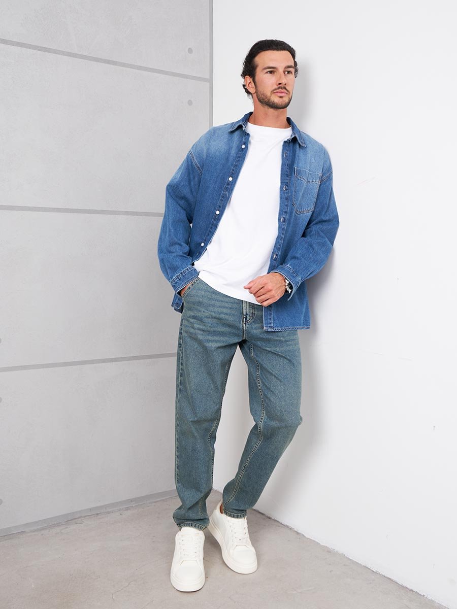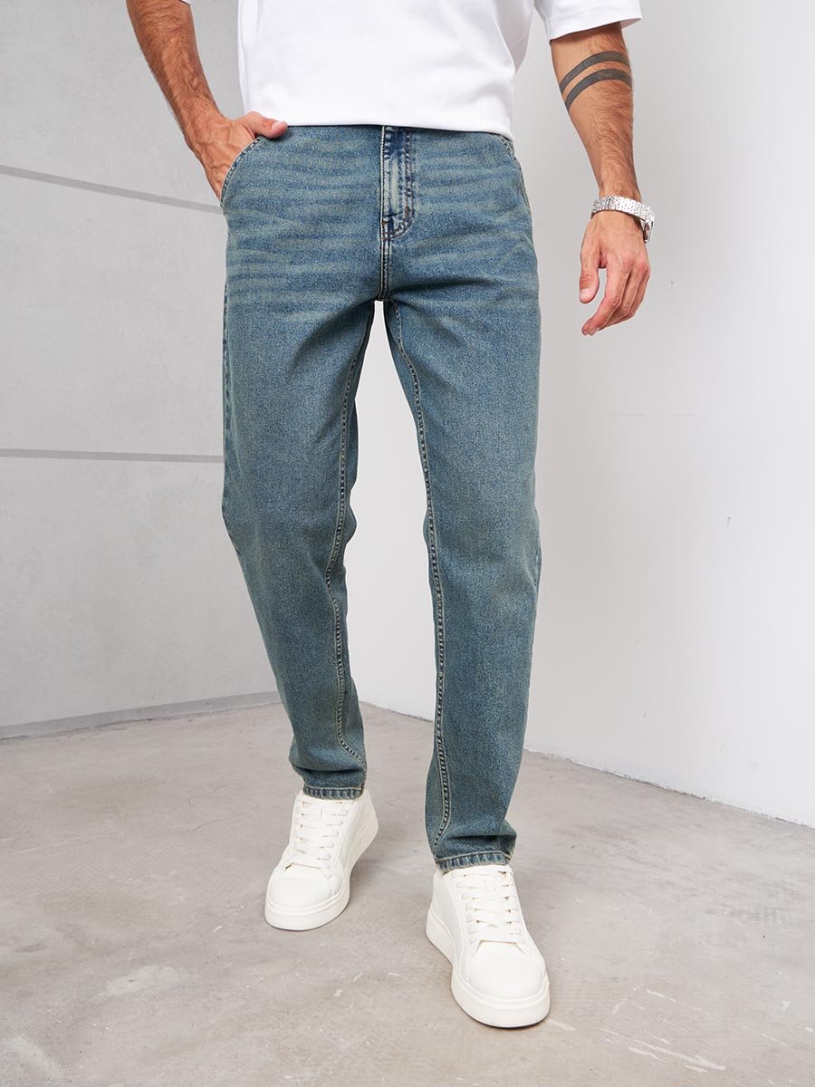 Мужские комфортные модные джинсы "Бананы" с пятью карманами.Для  удобства боковые карманы джинсов сделаны косыми , т.е.  карманы  "хулиганы".  Высокая талия, свободные по бедрам и бедру и узкие внизу. Застежка на молнии. Выполнены из классической  ткани denim, Классическая средняя стирка "stone wash".Джинсы дополнительно чуть-чуть подкрашены в желтый цвет для получения эффекта "GET DIRTY", т.е. эффекта запачканных джинсов.