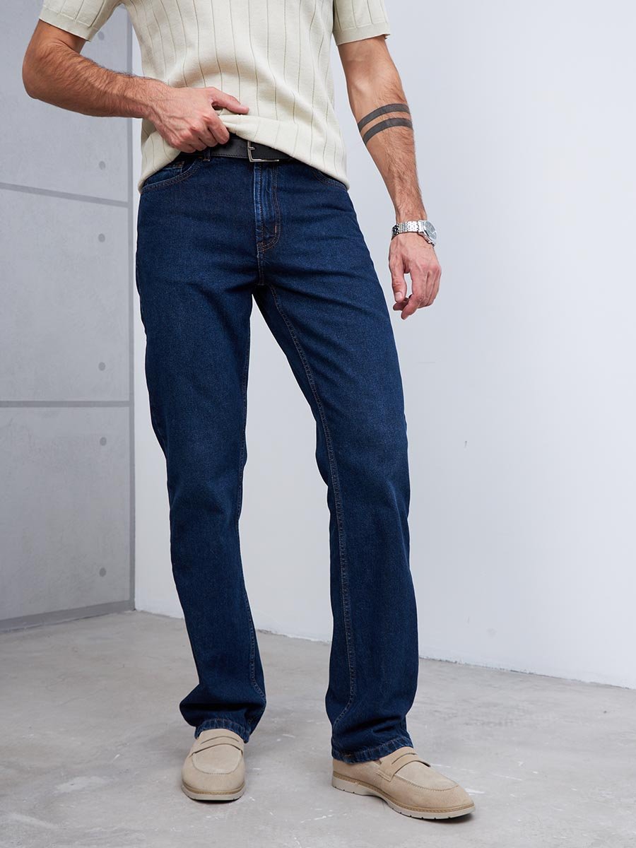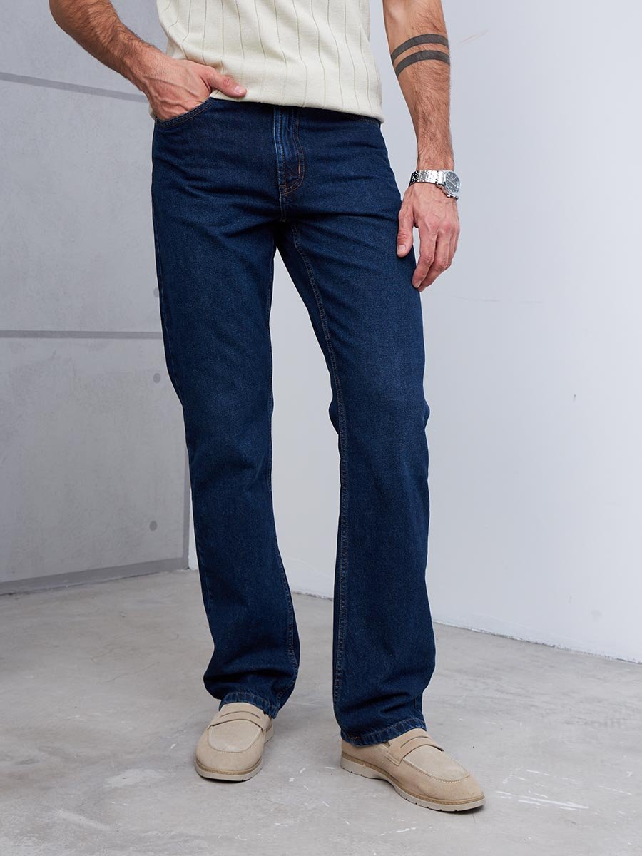 Мужские классические джинсы с пятью карманами. Эта модель выпускактся уже более 25-ти лет и все годы пользуется неизменной популярностью у наших покупателей. Посадка Regular fit (полуоблегающие по бедру), высокая талия, немного заужены к низу. Застежка на молнии. Выполнены из традиционной хлопковой ткани denim. Классическая темная стирка  "stone wash".