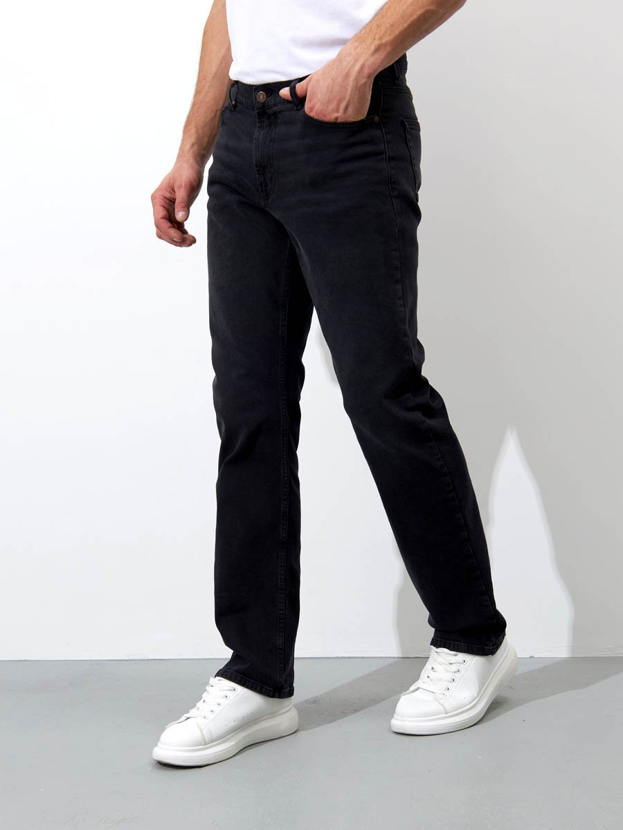 Мужские классические джинсы с пятью карманами. Посадка Regular fit (полуоблегающие по бедру), средняя высота талии. Застежка на молнии. Немного зауженные к низу. Выполнены из слабоэластичной ткани denim comfort stretch, цвет ткани  Black/Black (лицевая и изнаночная стороны ткани черные). Темная стирка со слабовыраженными потёртостями спереди и  сзади.