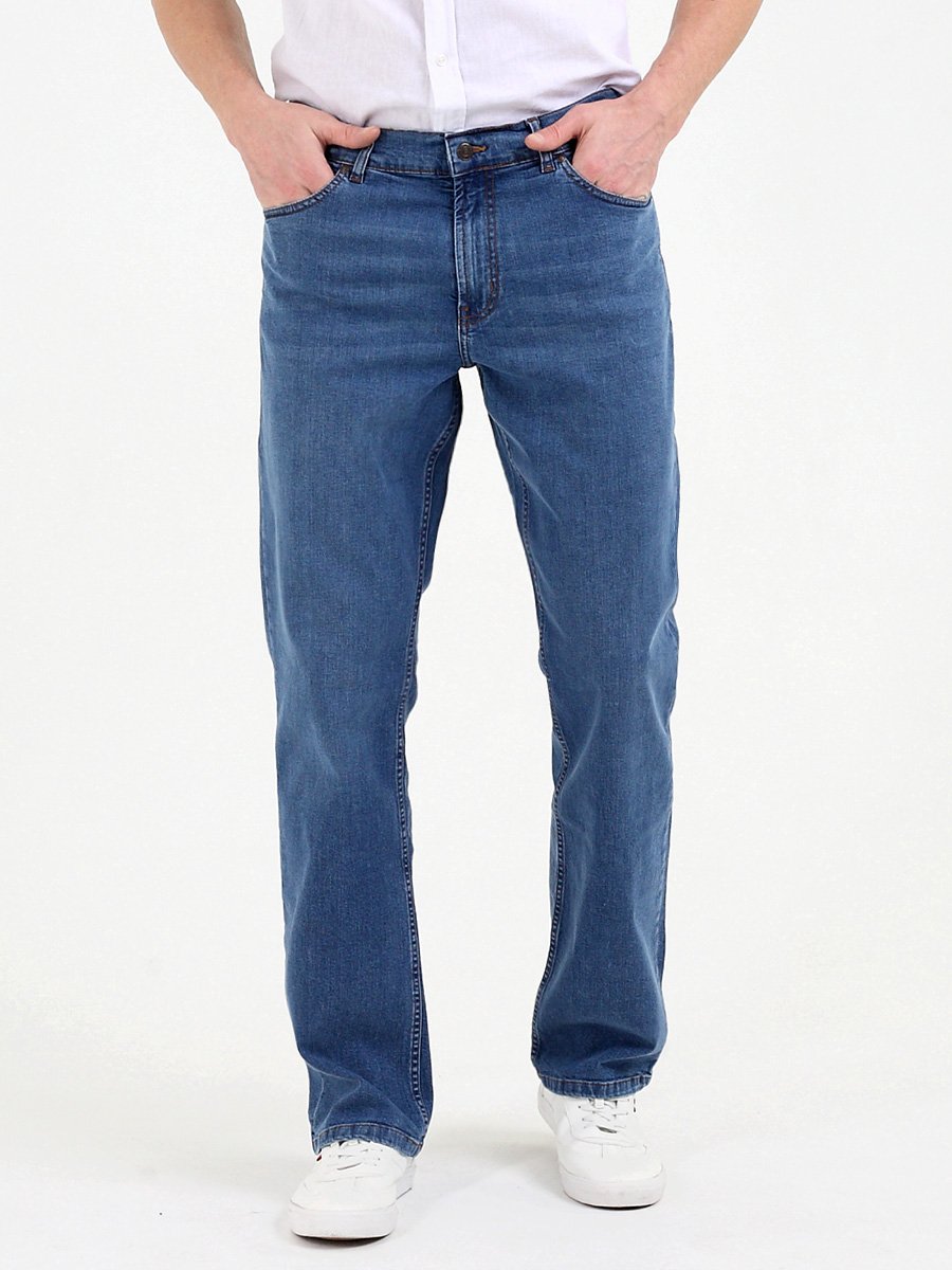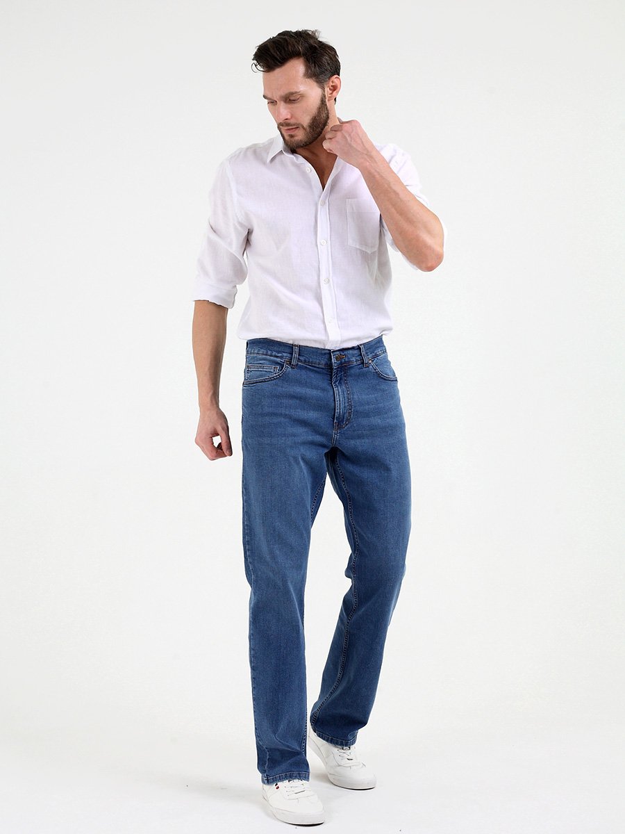 Мужские классические джинсы с пятью карманами. Посадка Regular fit (полуоблегающие по бедру), высокая талия. Застежка на молнии. Немного дополнительно заужены в колене и по низу по сравнению с моделью 0965. Выполнены из слабоэластичной ткани denim comfort stretch. Средняя стирка со слабовыраженными потёртостями спереди и сзади. Параметры указаны для размера 32. Длина внутреннего шва 83,5 см.