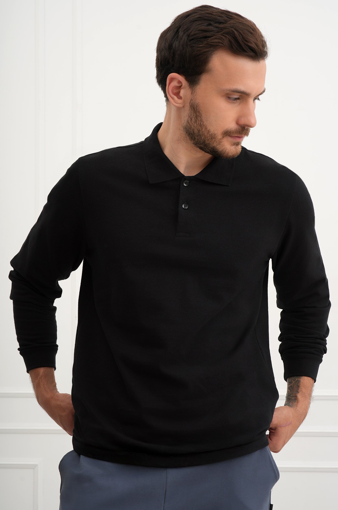 Черный лонгслив поло — лаконичный фаворит мужского гардероба, который всегда к месту. Идеальный баланс между комфортом и стильным минимализмом для повседневных образов.
