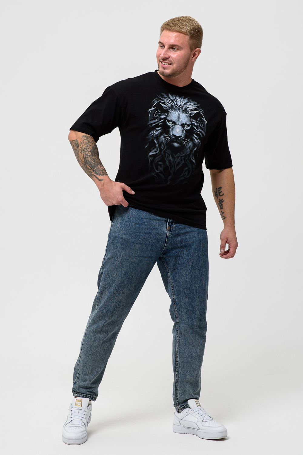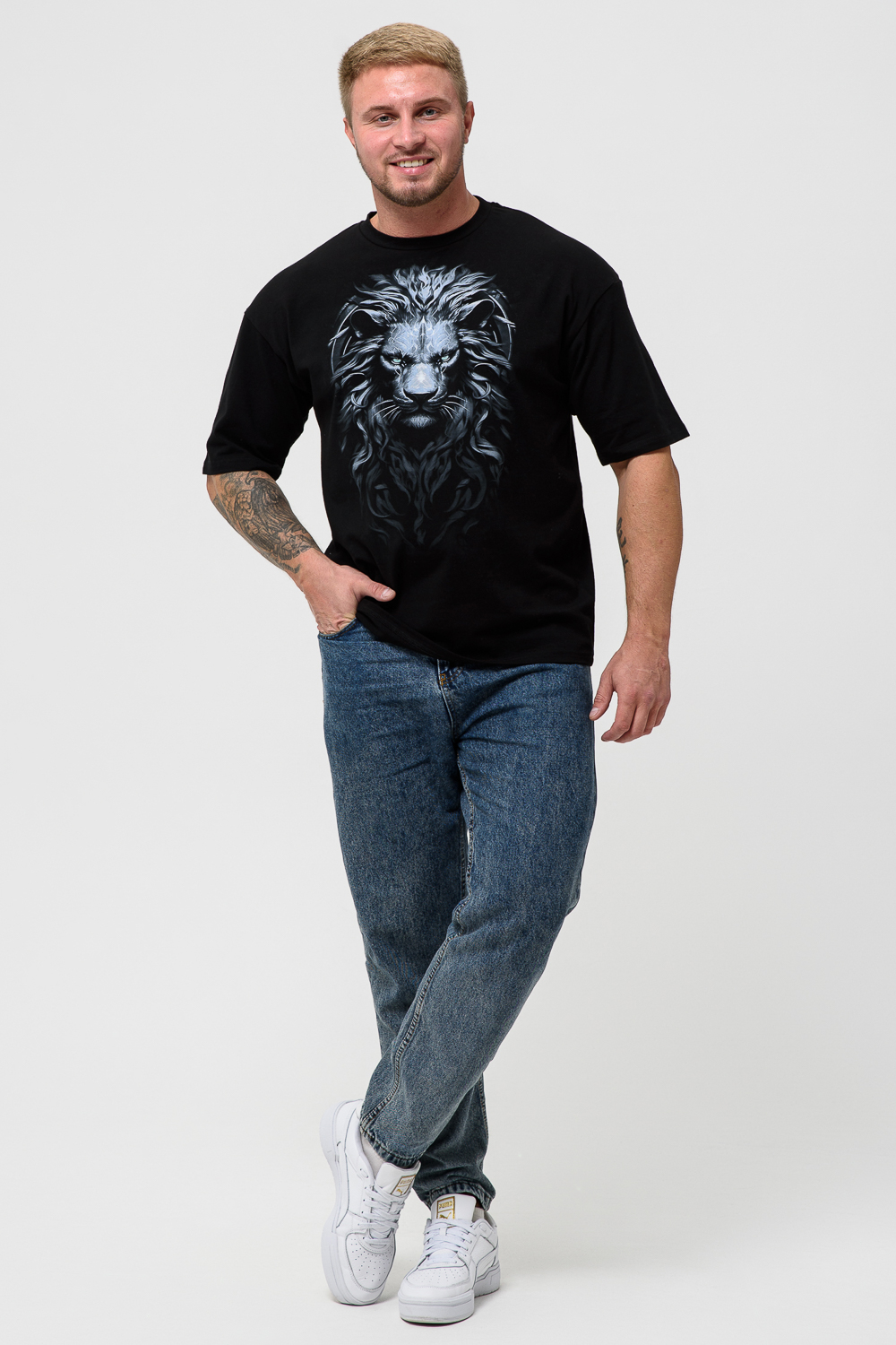 ХИТ сезона весна-лето! Стильная и модная футболка со спущенными плечом для мужчин создана, чтобы вписаться в дух времени. Она представляет собой оверсайз-модель со спущенными рукавами, которые придают ей особый шарм и оригинальность. Футболка подходит как для дома и отдыха, так и для активных тренировок. Высокая плотность 200гр/куб.м., материал кулирка с лайкрой. Широкий размерный ряд до 66 размера. Цвет: черный+лев; Материал: кулирка с лайкрой пенье; Состав: 92% х/б 8% эластан.