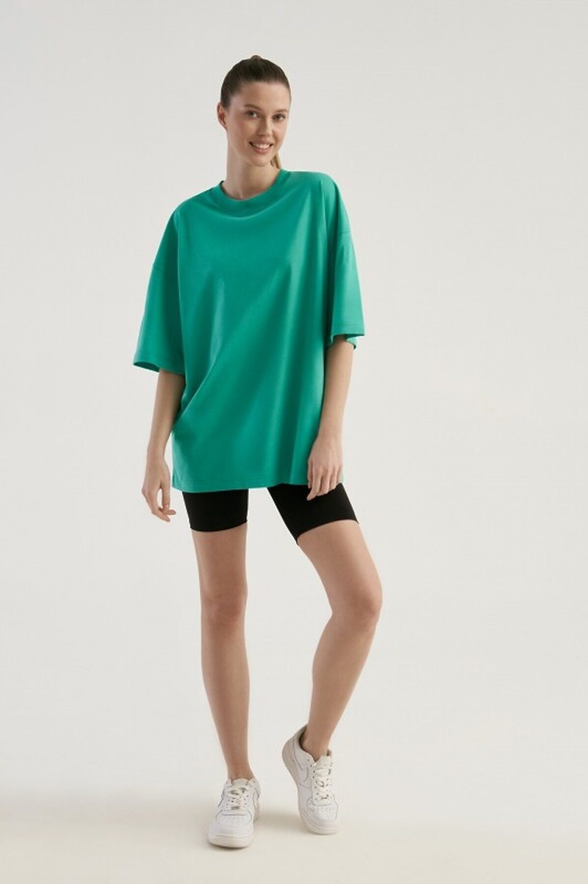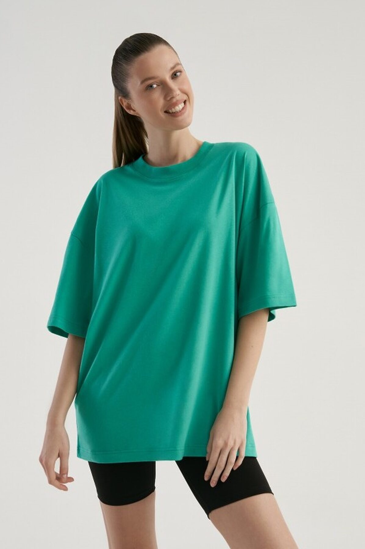 Футболка свободного силуэта. Спущенное плечо. Горловина из двух деталей, из рибаны.