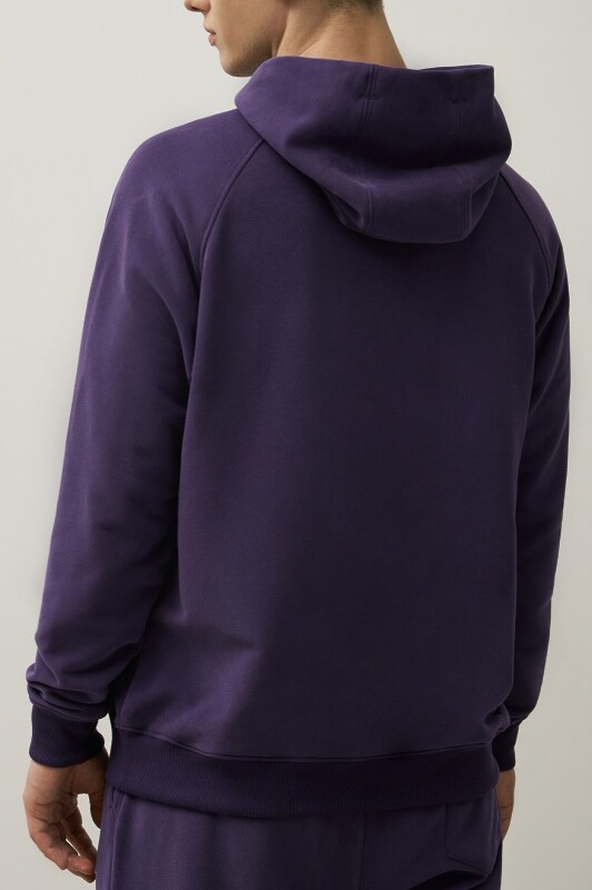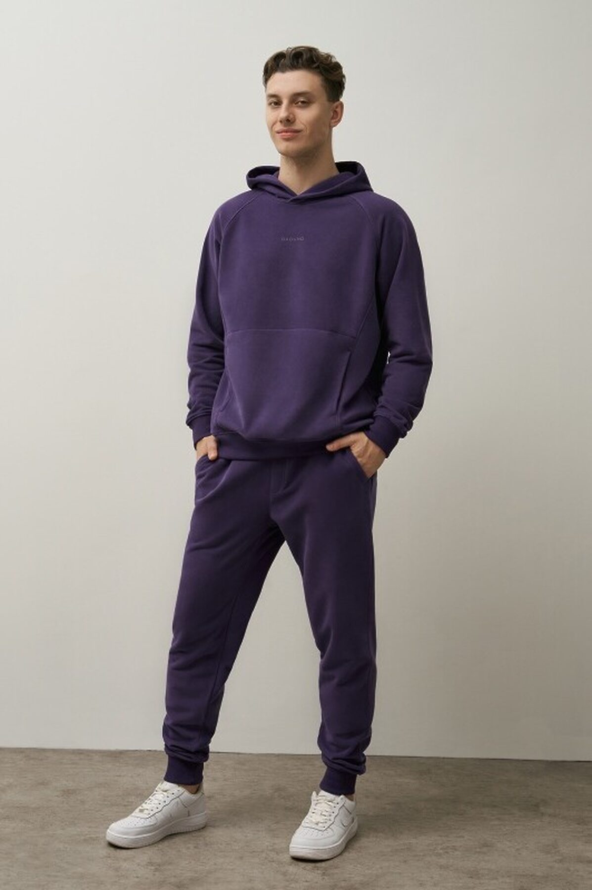Худи мужской свободного силуэта. Двойной капюшон, рукав реглан. Карманы в рельефных швах. Манжеты и пояс из кашкорсе.