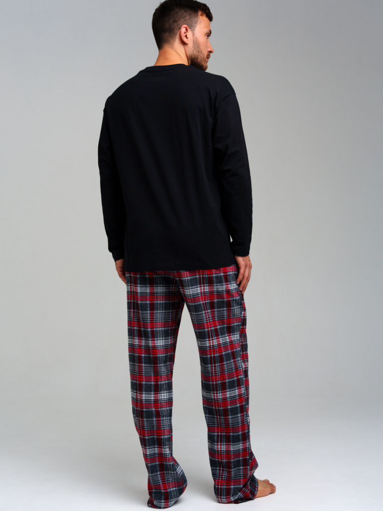 Мужская пижама. Лонгслив из качественного и приятного на ощупь трикотажа джерси с высоким содержанием хлопка 95%. Благодаря наличию эластана в составе ткани изделие проще в уходе и держит форму. Брюки - 100% хлопок. Фланель - мягкая, приятная к телу ткань с небольшим начесом. Эластичный пояс с тесьмой позволяет легко надевать брюки и утягивать до комфортной посадки.