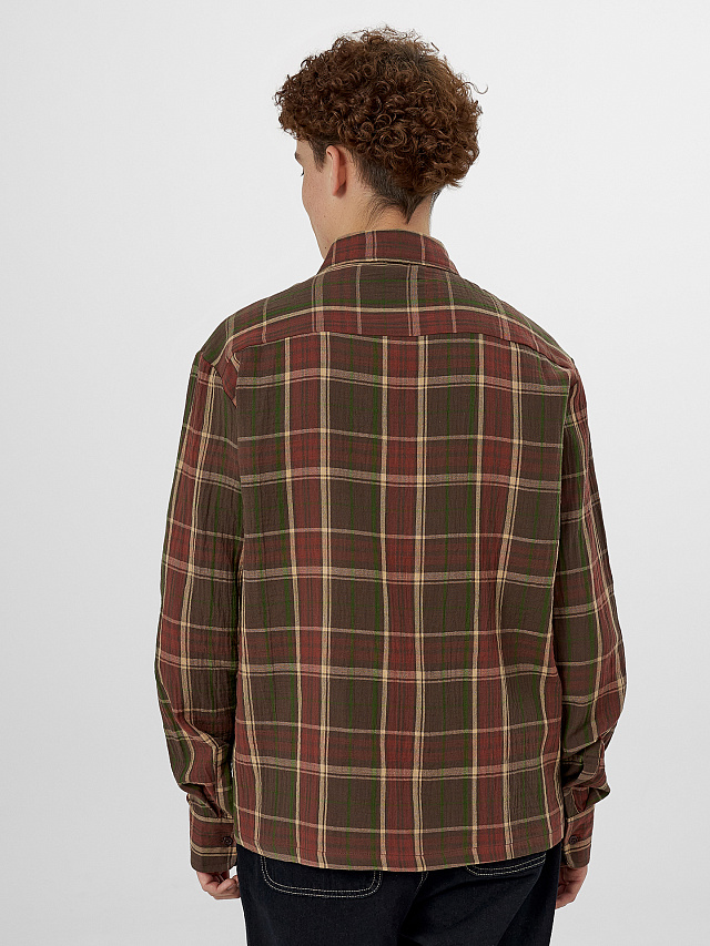 Отложной воротник и застежка на пуговицах позволяют легко варьировать степень формальности образа. Рубашка мужская с длинным рукавом дополнена манжетами с пуговицами – эта деталь добавляет образу аккуратности и завершенности. Универсальный коричневый цвет в сочетании с клеткой делает модель идеальной для создания как деловых, так и casual-комплектов.