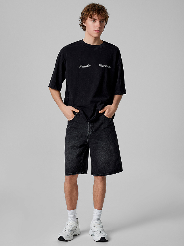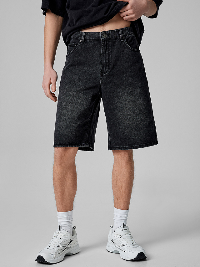 Черные джинсовые шорты-бермуды — модель свободного кроя, которая остаётся актуальной в тёплое время года. Средняя посадка и длина до колена делают их удобными для прогулок, путешествий и повседневной носки.