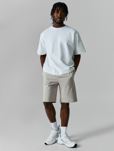 Мужские бежевые шорты — удобный вариант для тёплого времени года. Прямой свободный крой не сковывает движений и подходит для прогулок, активного отдыха или повседневной носки. Пояс цельный, с мягкой резинкой внутри.