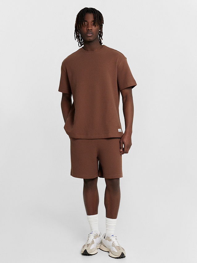 Мужские шорты свободного силуэта идеально подойдут для активного отдыха или повседневного образа. Длина до колен обеспечивает оптимальную посадку, а эластичный пояс гарантирует комфорт и свободу движений. Практичные карманы, расположенные в боковых швах, добавляют удобства, позволяя всегда держать необходимые мелочи под рукой. Швы на нижних срезах аккуратно обработаны вподгибку, что делает изделие еще более долговечным и аккуратным. Натуральный хлопок с вафельной текстурой придает изделию особенный шарм, обеспечивая коже дыхание и комфорт даже в жаркую погоду. Практичность и стиль, которые подойдут для любых повседневных задач.