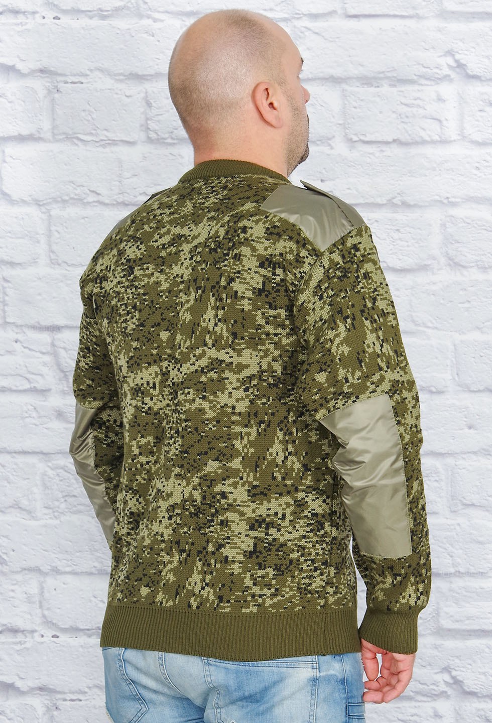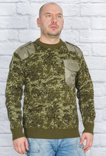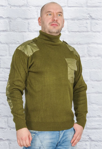Практичный армейский свитер с округлым вырезом горловины, связан из толстой полушерстяной пряжи содержащей 30% шерсти и 70% акрила. Крупная вязка обеспечивает хорошую теплоизоляцию, а натуральные волокна пряжи, поглощает влагу и сохраняют кожу сухой. Для защиты от протирания на изделие нашиты тканевые вставки на плечах и рукавах, а нагрудный карман добавляет одежде удобство и практичность.
