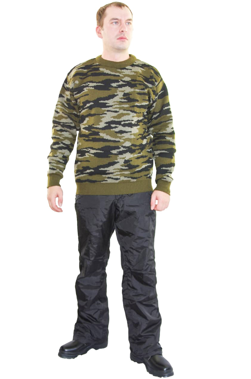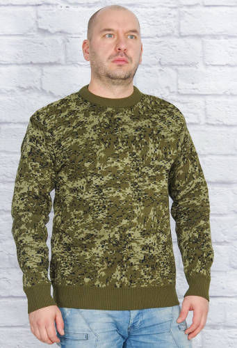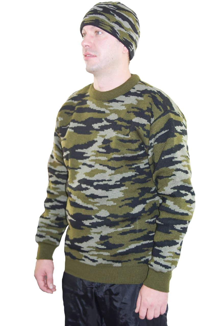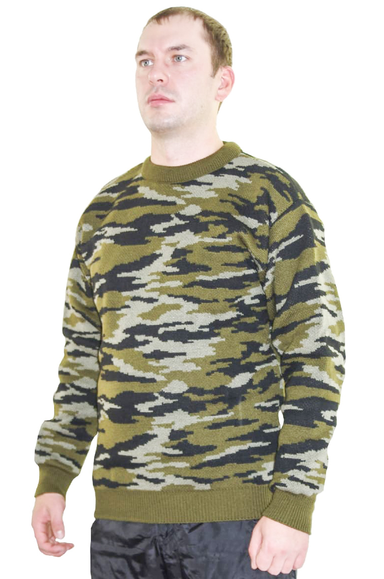 Камуфлированный вязанный свитер, изготовлен из высококачественной белорусской пряжи на оборудовании ведущих мировых производителей. Свитер сделан в соответствии с ГОСТом.