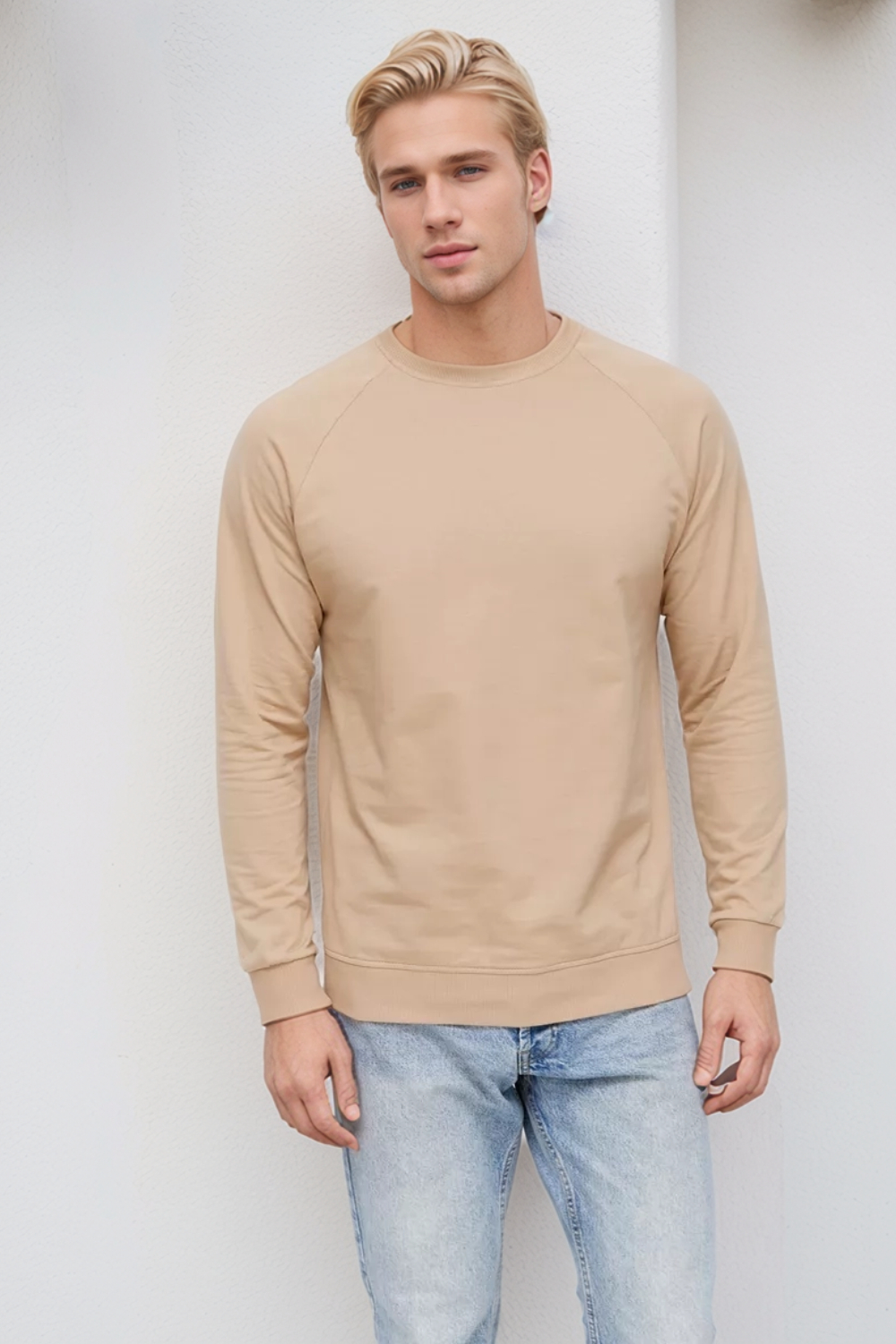 Свитшот мужской легкий однотонный из тонкого футера 2х нитки. Изготовлен из качественного футера двунитки без начеса. Натуральный состав ткани - 95% турецкий хлопок и 5% лайкра (эластан). Круглый вырез не растягивается и не деформируется. Сшита из мягкой и не толстой ткани без начеса, а значит в нем будет не жарко и не холодно в помещении. Базовая кофта для образов в стиле кэжуал (casual). Подойдет для работы в офисе и свидания в кафе, для автомобиля, прогулки, спортивного лука на осень, весну и лето. Толстовка обеспечивает комфорт и вентиляцию, не сковывает движения. Длина рукава измеряется от горловины. Обращаем внимание, что свитшот подходит на рост от 158 до 176см. Цвет: бежевый; Материал: футер 2-х нитка;футер 2-х нитка; Состав: 92 % хлопок, 8 % эластан.