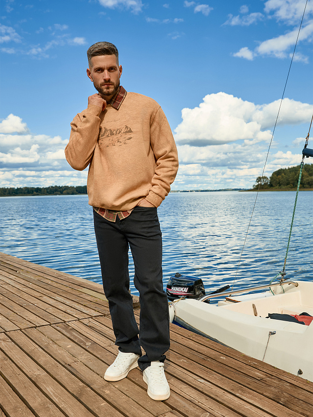 Удобная округлая горловина отделана эластичной рибаной для комфортной посадки. Шов на спинке аккуратно закрыт хлопковой тесьмой, что повышает износостойкость изделия. Слегка спущенная линия плеч и длинные рукава с манжетами из рибаны обеспечивают полную свободу движений. Отрезной пояс по низу из эластичной рибаны помогает сохранить форму изделия при носке.