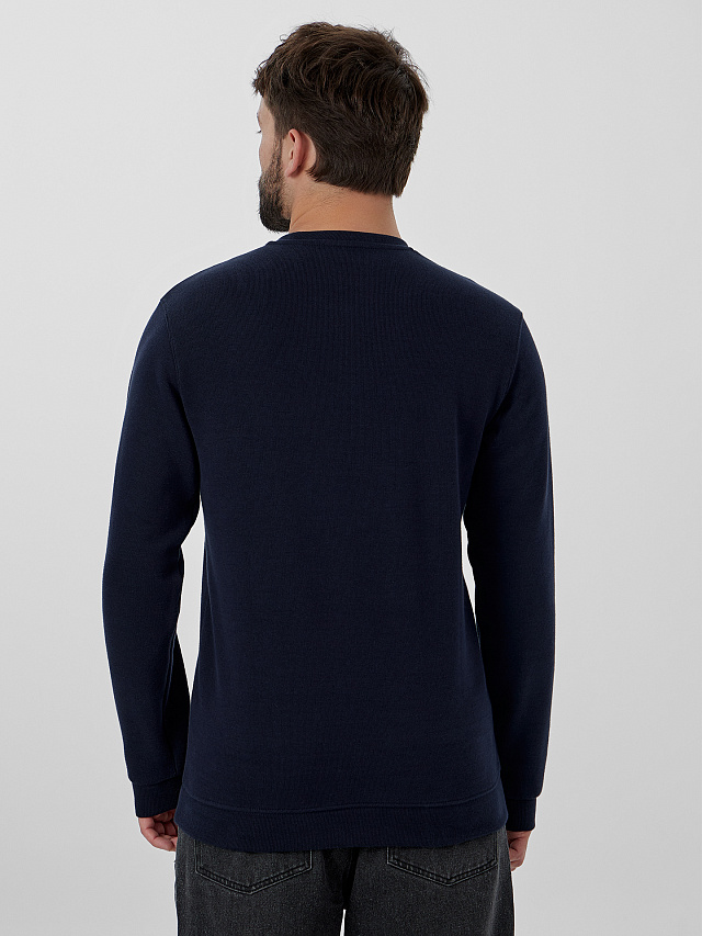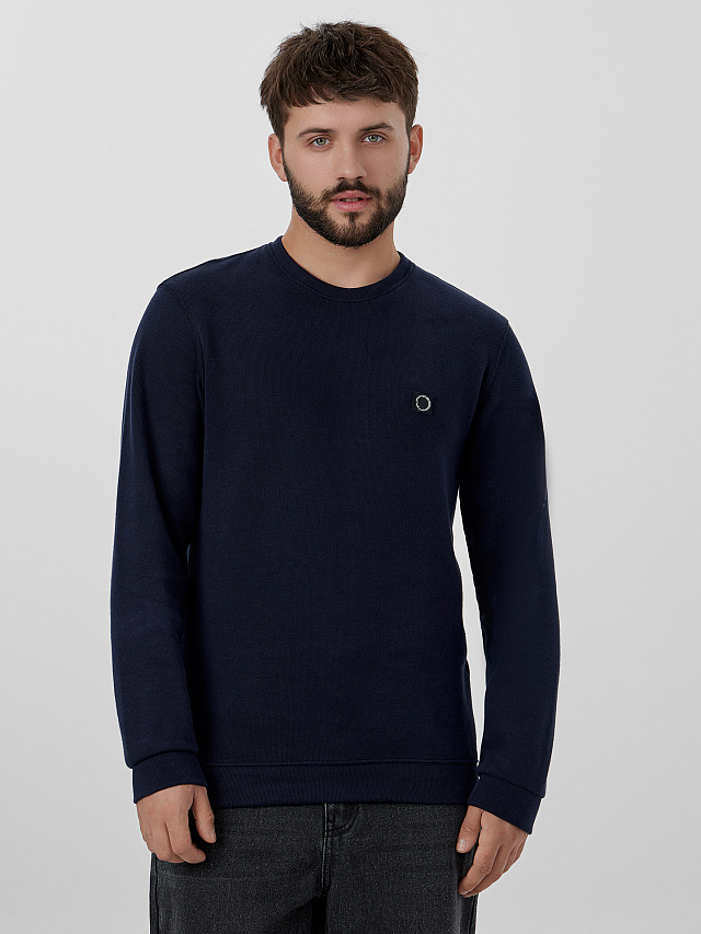 Сине-черный мужской свитшот — стильная и практичная модель для повседневной носки. Свитшот свободного прямого кроя выполнен из плотного трикотажа, который сохраняет тепло и обеспечивает комфорт. Слегка спущенная линия плеча и длинные рукава не сковывают движений.
