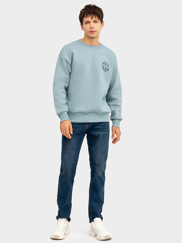 Джемпер прямого силуэта из трикотажного футера с теплым подчесом. Горловина круглой формы, окантована широкой бейкой из рибаны. Плечо слегка спущено, рукава длинные, с манжетами из рибаны – как и пояс, проходящий по низу джемпера. Стильно!