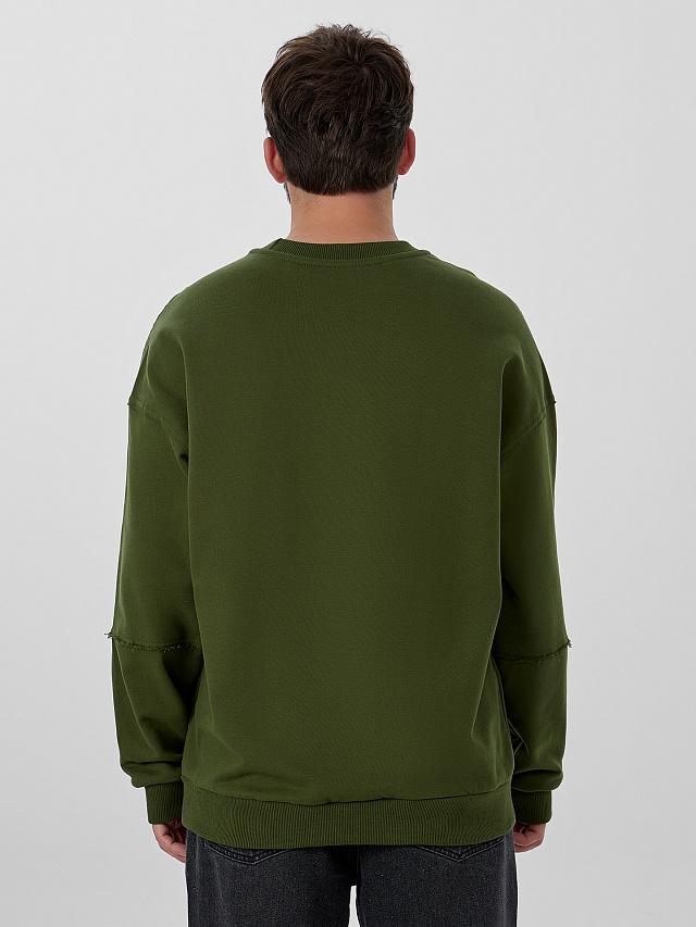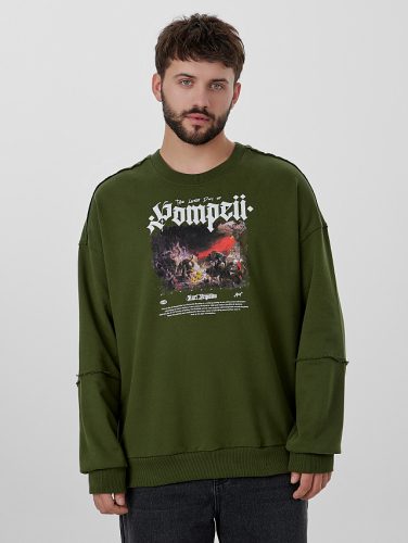 Зеленый мужской свитшот с художественной печатью — для ценителей искусства и стиля. На груди изображена картина «Последний день Помпеи» с надписью на английском языке «The Last Day of Pompeii». Под изображением размещена краткая история создания шедевра.