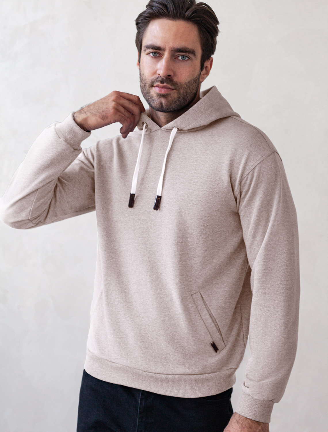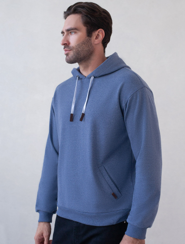 Худи выполнено из эластичного футера трехнитки-петля с эффектом меланж. Лаконичная модель с капюшоном и двумя боковыми карманами дополнена хлопковым шнуром с наконечниками из эко-кожи. Наличие эластана в составе гарантирует комфорт и формоустойчивость. Изделие не сковывает движений. В теплое время года можно использовать вместо верхней одежды.