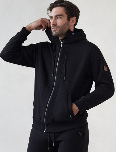 Худи на молнии выполнено из премиального эластичного футера трехнитки с теплым начесом. Модель с капюшоном и воротом стойка дополнена боковыми карманами и нашивкой с логотипом бренда из эко-кожи. Ранней осенью или поздней весной можно носить в качестве верхней одежды. Высококачественная фурнитура цвета темное серебро. Изделие сочетается в костюме с брюками U44.006