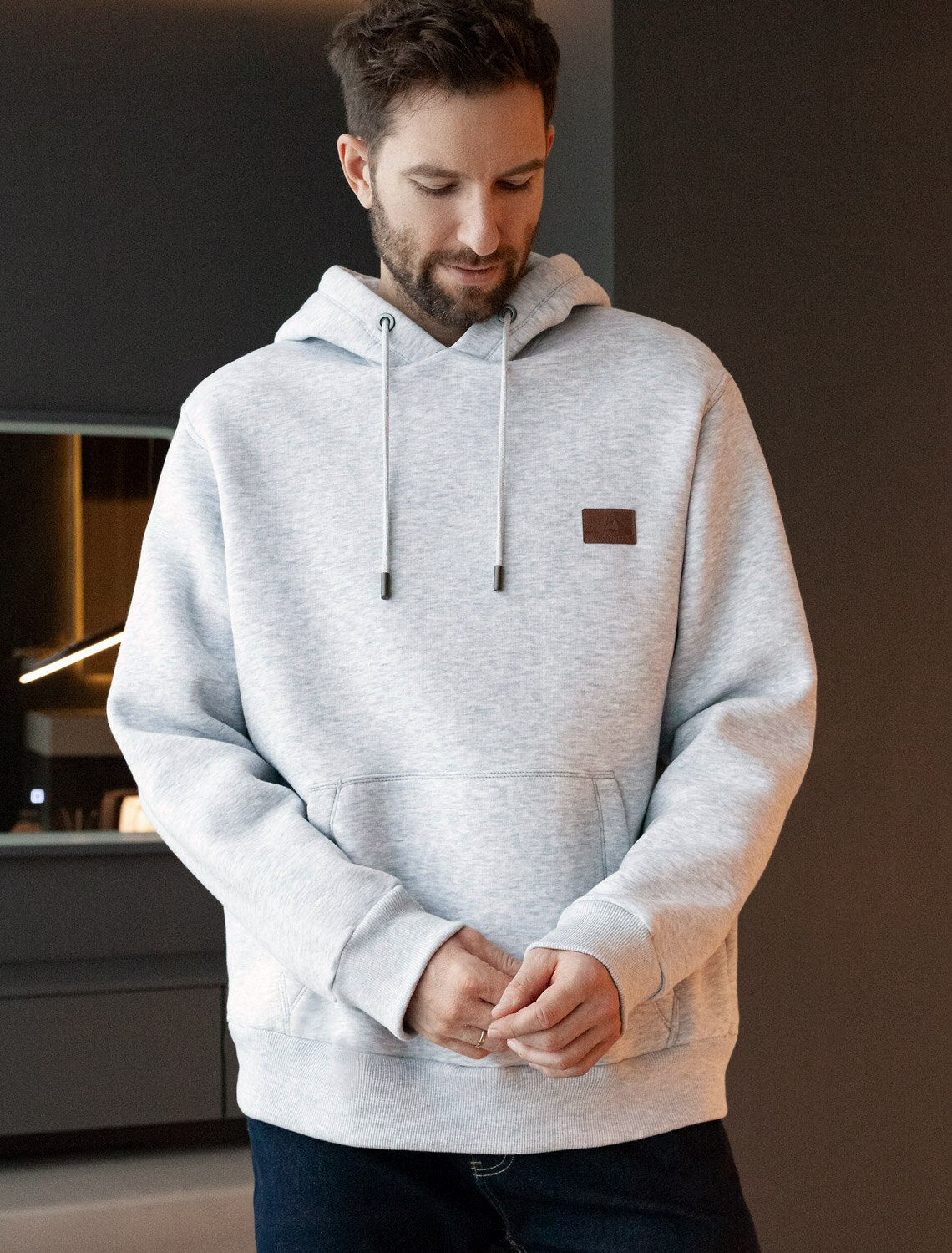 Худи выполнено из премиального эластичного футера трехнитки с теплым начесом. Уютная и классическая модель с капюшоном и карманом-кенгуру дополнена нашивкой с логотипом бренда из эко-кожи. Свободный крой не сковывает движений. Высококачественная фурнитура цвета темное серебро. Изделие сочетается в костюме с брюками U44.006