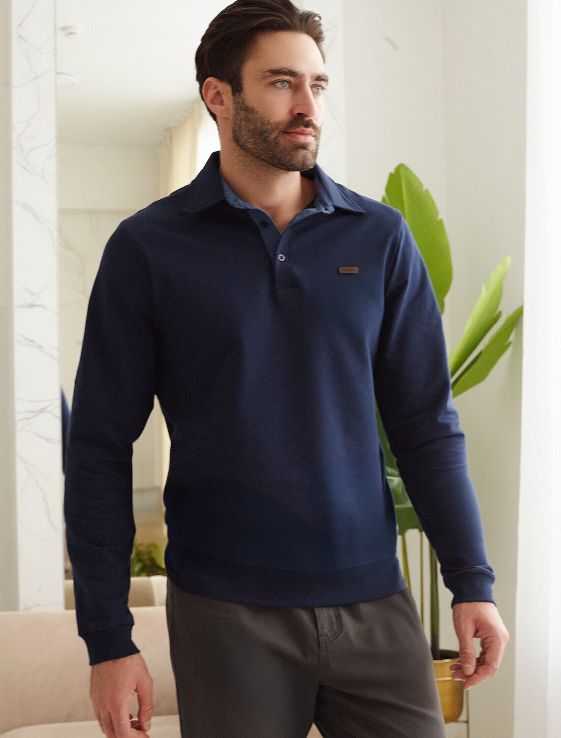 Джемпер с воротом поло выполнен из эластичного футера. Застежка планка дополнена пуговицами с логотипом бренда. Мягкий и плотный материал хорошо пропускает воздух, а наличие ПЭ в составе способствует формоустойчивости и легкости изделия. На груди фирменная нашивка из эко-кожи.