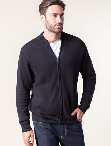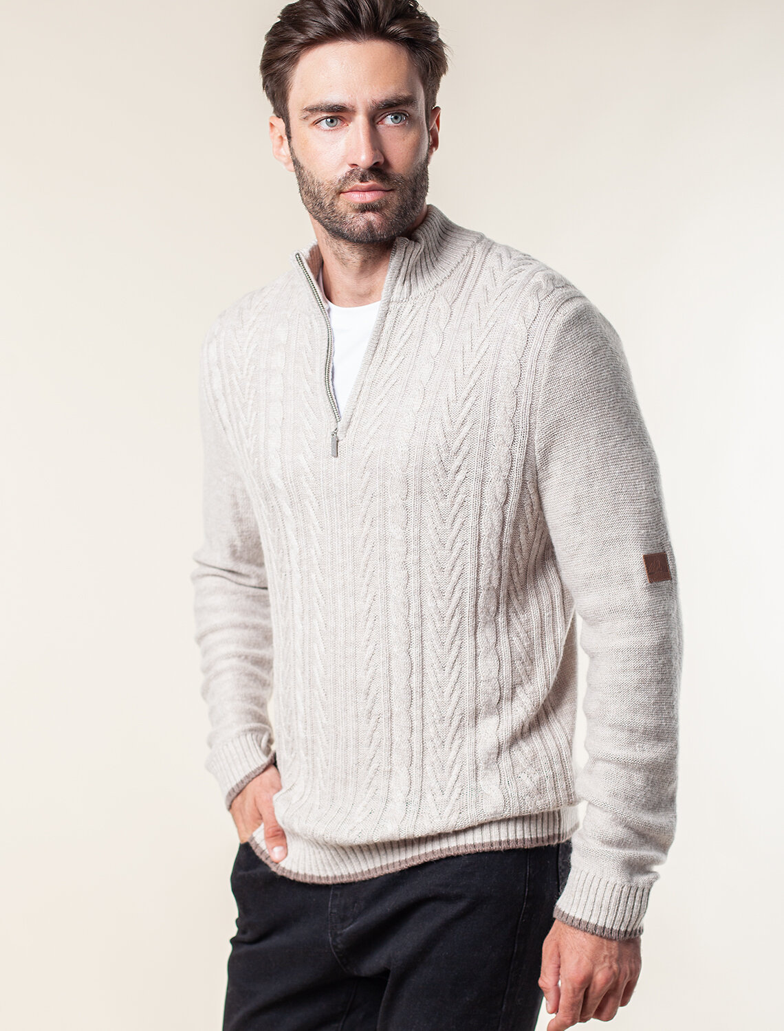 Свитер фактурной крупной вязки с узором косы дополнен металлической молнией на вороте. Модель выполнена их теплой пряжи с шерстью. Отлично держит тепло, при этом не перегревая. Дополнит как повседневный образ, так и нестрогий офисный комплект, с рубашками, футболками или водолазкой. На рукаве изделия нашивка бренда из эко-кожи.