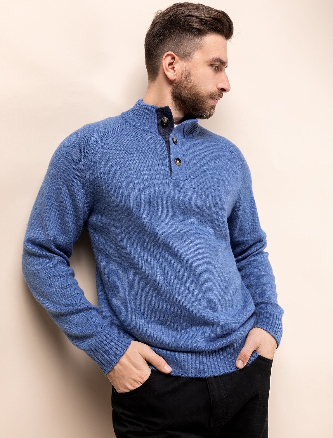 Свитер из теплой пряжи с шерстью с застежкой на акцентные черепаховые пуговицы. Внутри стойки контрастная пряжа, с помощью пуговиц можно регулировать высоту воротника и носить свитер как джемпер. Гармонично дополнит как повседневный образ, так и нестрогий офисный комплект, с рубашками, футболками или водолазкой. Модель дополнена фирменным логотипом бренда.