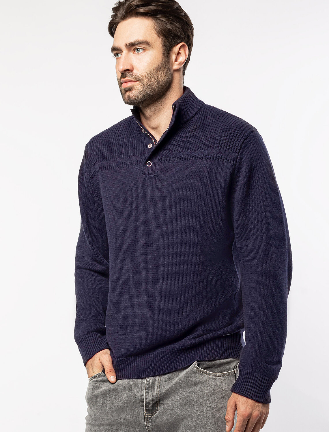 Свитер фактурной вязки с застежкой на крупные кнопки выполнен из мягкой хлопковой пряжи с добавлением акрила. Модель из такого материала не препятствует циркуляции воздуха, но при этом хорошо сохраняет тепло и не колется, поэтому ее комфортно носить на голое тело. С помощью кнопок можно регулировать высоту воротника и носить свитер по-разному. Внизу изделия нашивка бренда из эко-кожи.