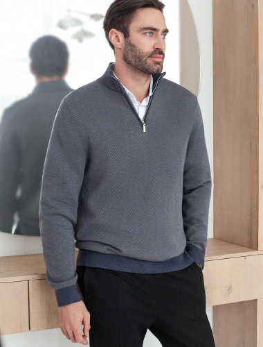 Темно-синий джемпер с длинными рукавами выполнен из мягкой хлопковой пряжи с добавлением акрила. Высокий воротник застегивается молнией. За счет переплетения светлых и темных нитей получилась фактурная меланжевая модель, которая, отлично держит тепло и почти не ощущается на теле. Сочетается с футболками, денимом и с чиносами, любой обувью.