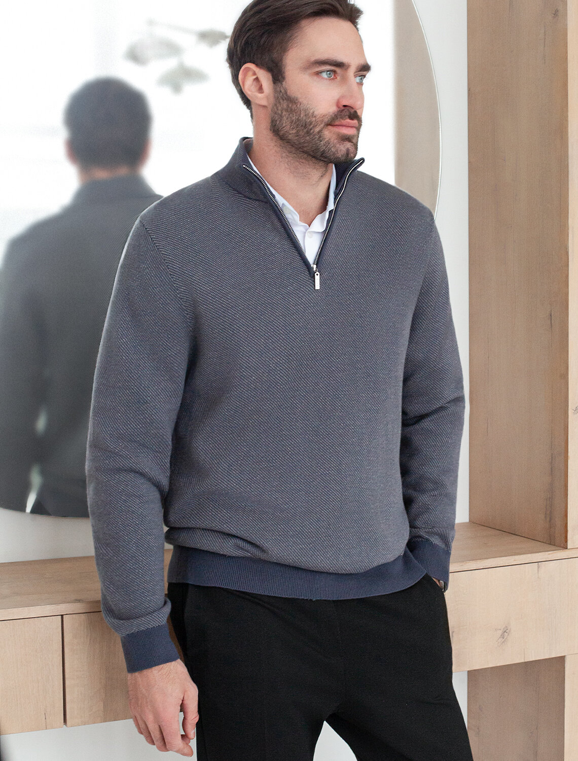Серый джемпер с длинными рукавами выполнен из мягкой хлопковой пряжи с добавлением акрила. Высокий воротник застегивается молнией. За счет переплетения светлых и темных нитей получилась фактурная меланжевая модель, которая, отлично держит тепло и почти не ощущается на теле. Сочетается с футболками, денимом и с чиносами, любой обувью.