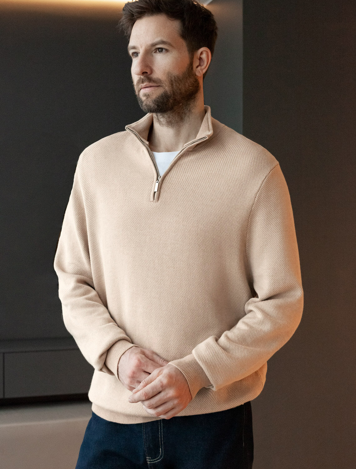 Бежевый джемпер с длинными рукавами выполнен из мягкой хлопковой пряжи с добавлением акрила. Высокий воротник застегивается молнией. За счет переплетения светлых и темных нитей получилась фактурная меланжевая модель, которая, отлично держит тепло и почти не ощущается на теле. Сочетается с футболками, денимом и с чиносами, любой обувью.