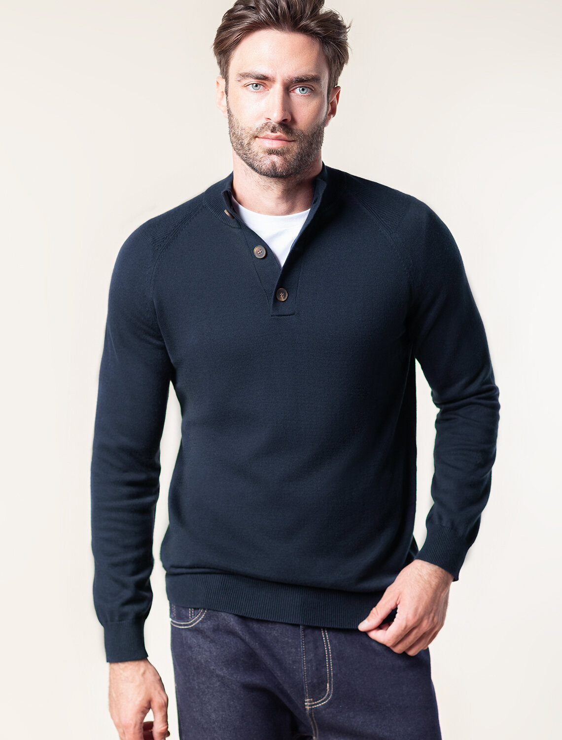 Темно-синий джемпер с воротом, застегивающимся на черепаховые пуговицы, связали из мягкого хлопка с добавлением акрила; состав, который отлично согревает, не колется и при этом не перегревает тело, поэтому вещь получилась максимально комфортной для переменчивой погоды. Повседневный образ поддержат светлые брюки, синие джинсы и броги.