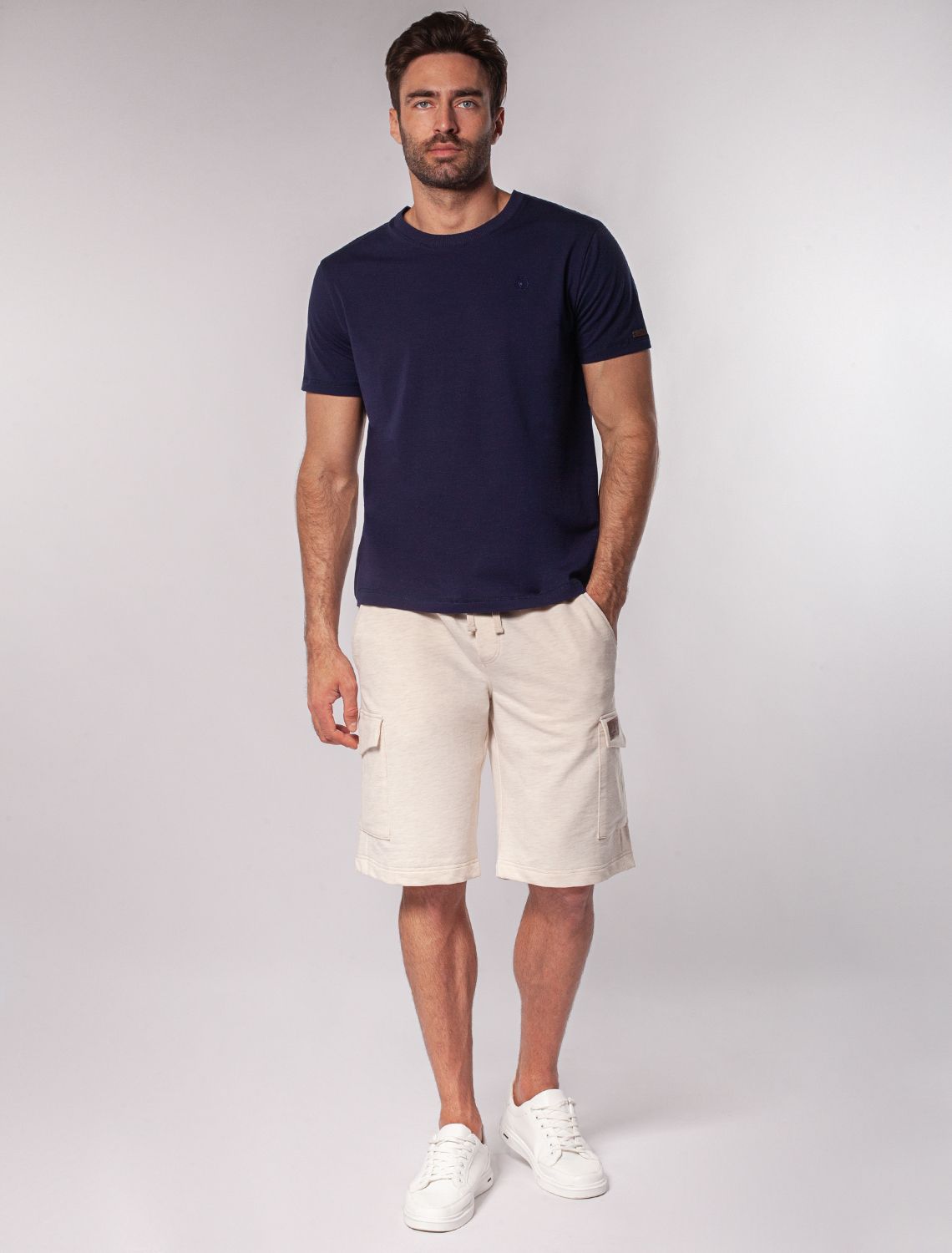 Шорты выполнены из легкого футера с эластаном. Мягкий материал хорошо пропускает воздух и поддерживает оптимальный микроклимат даже в жаркое время года, поэтому в изделии будет комфортно в течении всего дня. На кармане нашивка логотип бренда из эко-кожи. бежевый меланж