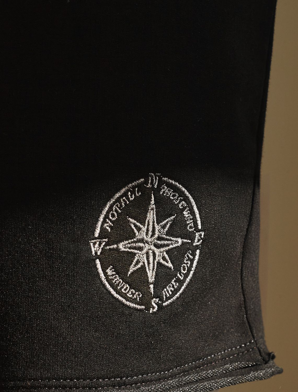 Перевод принта: not all those who wander are lost - не все, кто бродят по миру, потеряли свой путь. Шорты в черном оттенке выполнены из тонкого футера. Модель прямого кроя дополнена трендовыми открытыми срезами и лаконичной вышивкой роза ветров. Эластичный пояс на резинке с внутренним шнуром комфортно фиксирует изделие не сковывая движений. По бокам удобные карманы. Наличие ПЭ в составе изделия способствует формоустойчивости. Фирменный металлический логотип бренда и нашивка из эко-кожи.
