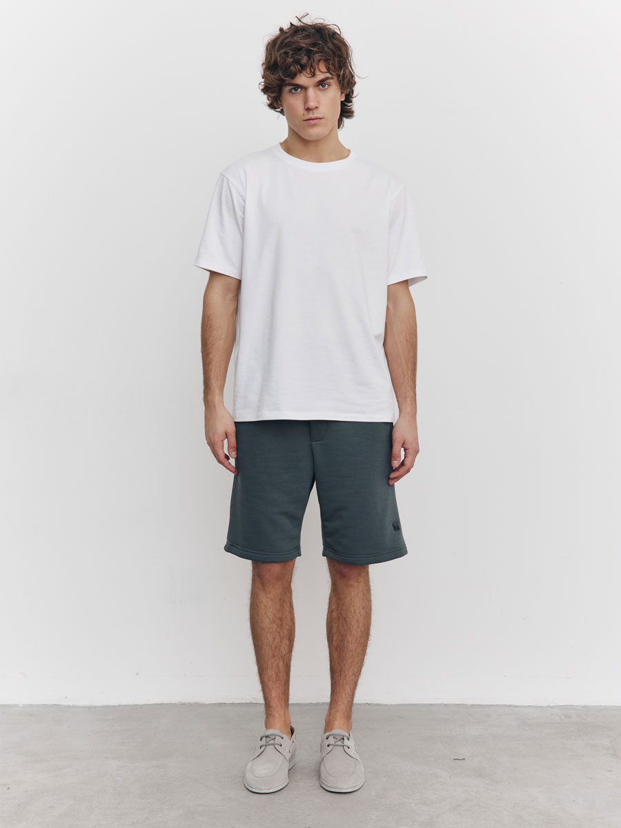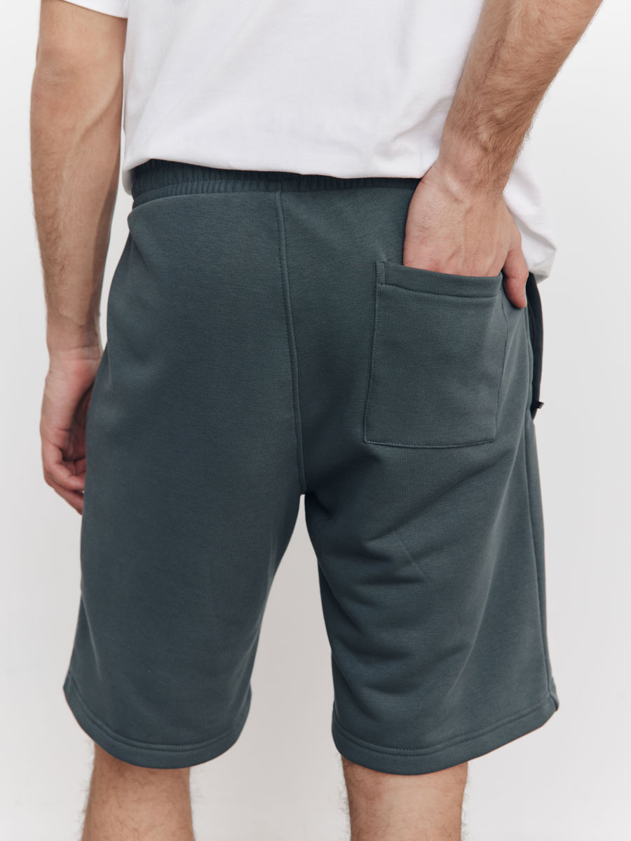 Мужские шорты из футера 3-х нитка петля, с отрезным поясом, строчёным с эластичной тесьмой. С изнаночной стороны пояса петли, через которые продет шнур. Боковые карманы прорезные с листочками на молниях. На левой половинке шорт – имитация гульфика. На правой задней половинке шорт – накладной карман. Низ шорт подшит на плоскошовной машине.