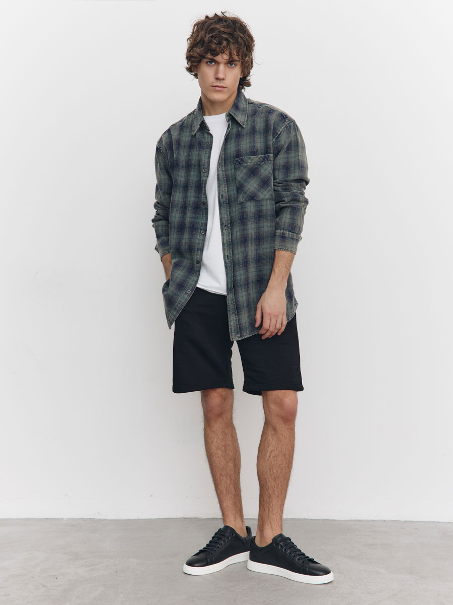 Мужские шорты из футера 3-х нитка петля, с отрезным поясом, строчёным с эластичной тесьмой. С изнаночной стороны пояса петли, через которые продет шнур. Боковые карманы прорезные с листочками на молниях. На левой половинке шорт – имитация гульфика. На правой задней половинке шорт – накладной карман. Низ шорт подшит на плоскошовной машине.