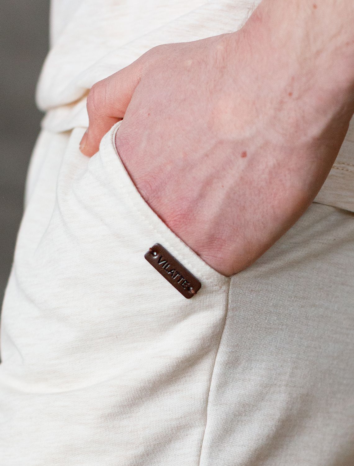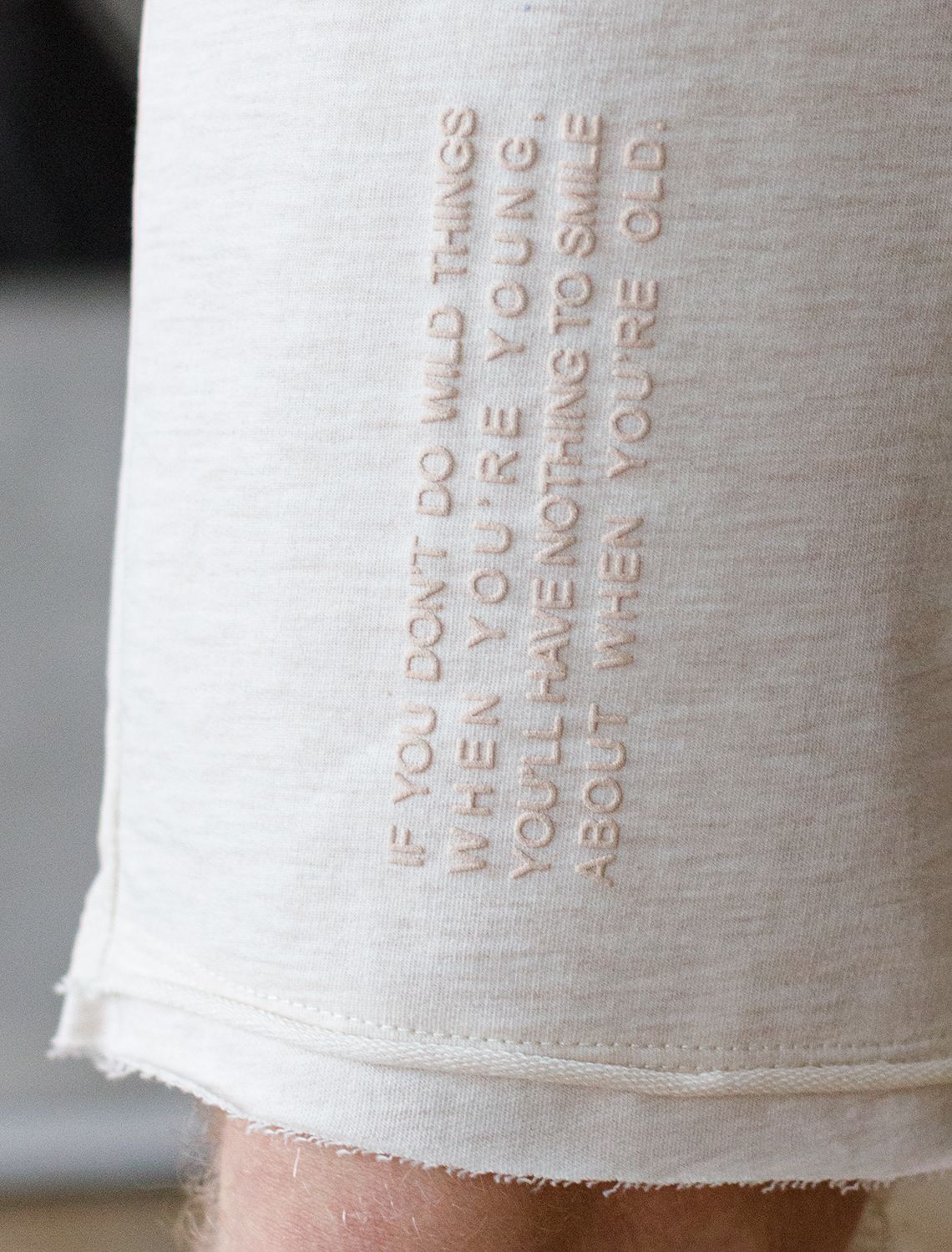 Шорты выполнены из тонкого футера. Эластичный пояс на резинке. Мягкая хлопковая ткань очень приятная к коже, в которой будет комфортно на протяжении всего дня. Изделие украшено авторским принтом на нашивке и логотипом бренда на эко-коже. Модель сочетается в комплекте с футболкой U49.011 бежевый меланж