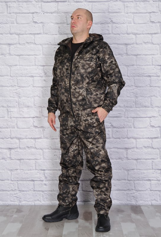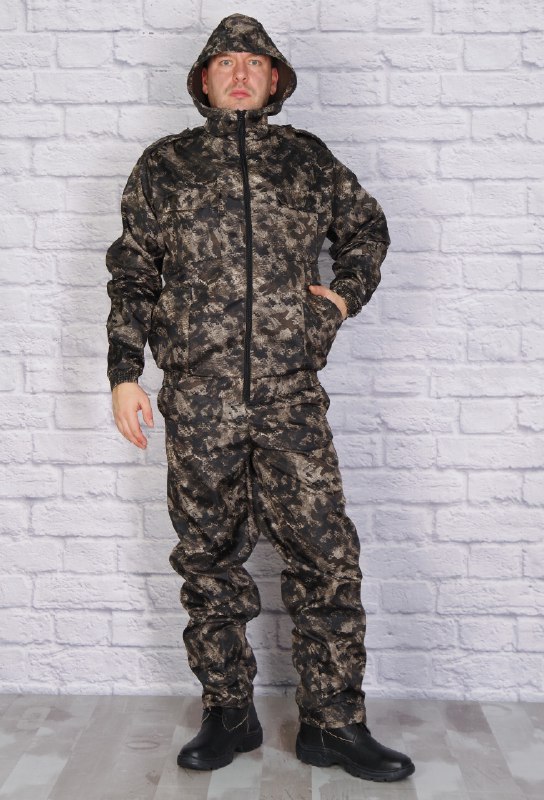 Демисезонный костюм состоит из укороченной куртки с притачным поясом, стянутым по бокам эластичной лентой и брюк прямого кроя. Модель с капюшоном, центральная застежка-молния, воротник-стойка. Два верхних накладных кармана с клапаном и два нижних накладных кармана со скошенным входом. Брюки с боковыми карманами, притачным поясом, стянутым эластичной лентой.