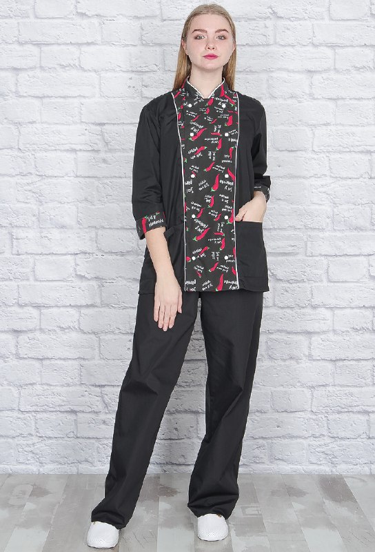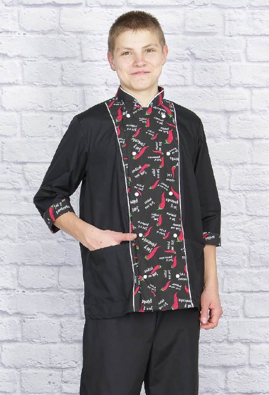 Костюм "Шеф-Повара" в черном варианте с цветной вставкой состоит из кителя и брюк.