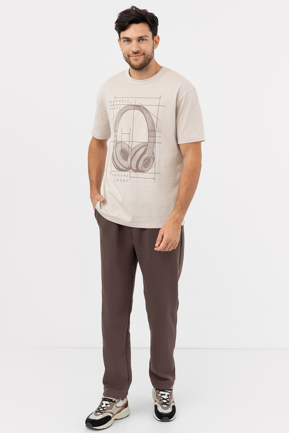 Прямые свободные брюки для мужчин. Выполнены из тёплого футера с подчёсом. Пояс с эластичной тесьмой внутри и шнурком-завязкой, который позволяет регулировать ширину в талии. Есть удобные боковые карманы. Гульфик не функциональный, имитация. Штанины подогнуты. Рекомендуем!
