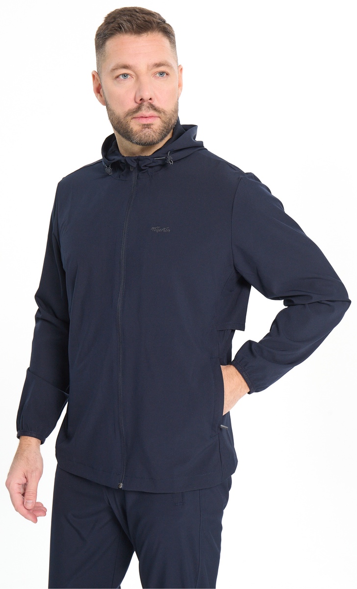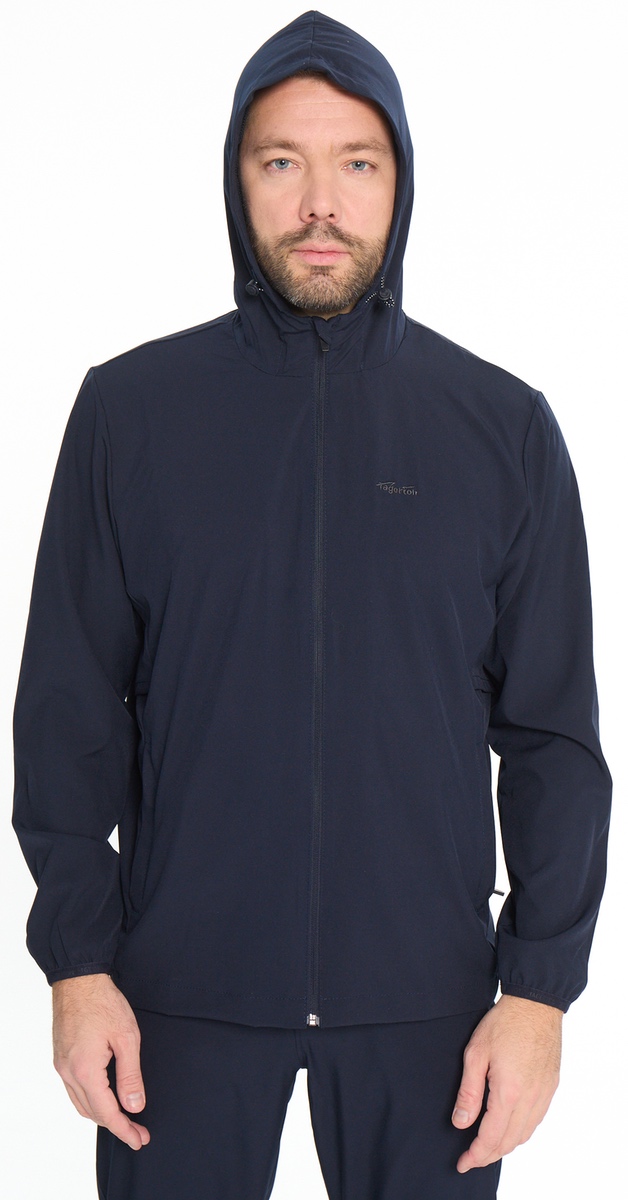 Ветровка на молнии прямого силуэта с капюшоном, отделанным с внутренней стороны трикотажной сеткой. Ширина капюшона регулируется кулиской из шляпной резинки с пластиковыми стопперами. Низы рукавов обработаны окантовочной резинкой с логотипом в фирменном стиле Tagerton. Для дополнительной воздухопроницаемости подмышками предусмотрены специальные вентиляционные разрезы, закрытые трикотажной сеткой. Передние карманы на молниях под листочками. С левой стороны вышивка в тон основного материала.