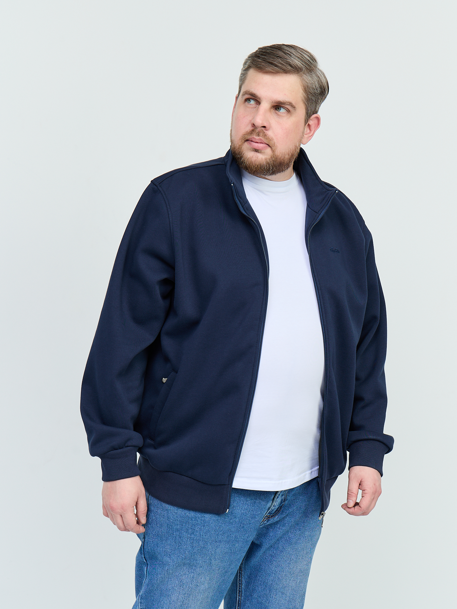 Мужская толстовка на молнии с поясом из кашкорсе и воротником-стойкой, выполненным из основного материала. Основной материал – 3-х ниточный футер, бондированный с внутренней стороны подкладкой из искусственного меха, мягкой, приятной на ощупь. Передние карманы на молниях под листочками. Изделие удобное и практичное. Может использоваться как верхняя одежда в качестве утеплённой ветровки или лёгкой куртки в межсезонье, а также как одежда второго слоя под пальто или тёплую куртку в зимний период. Ворот-стойка надёжно защищает шею от холода. Тёмно-синий цвет толстовки выигрышно смотрится с джинсами.