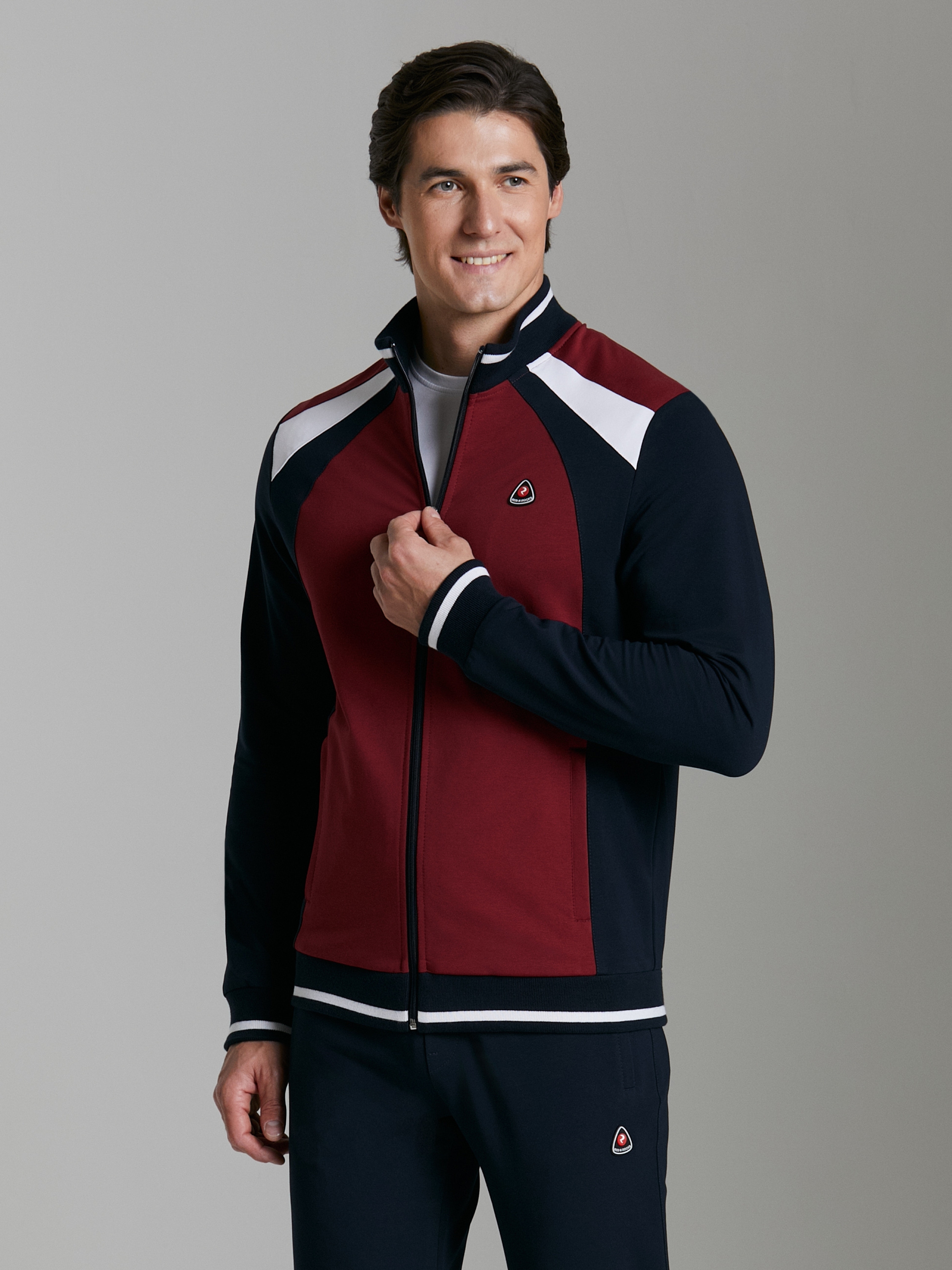 Костюм мужской из хлопкового трикотажного полотна. Модель выполнена в красочном дизайне: органично подобраны цвета. Куртка на молнии с воротником, с прорезными карманами с листочкой, воротник, низ куртки и рукавов обработаны трикотажной рибаной из хлопка для плотного прилегания к телу. Пояс по линии талии регулируется шнурком. На полочке и брюках настрочен шеврон с фирменным логотипом.