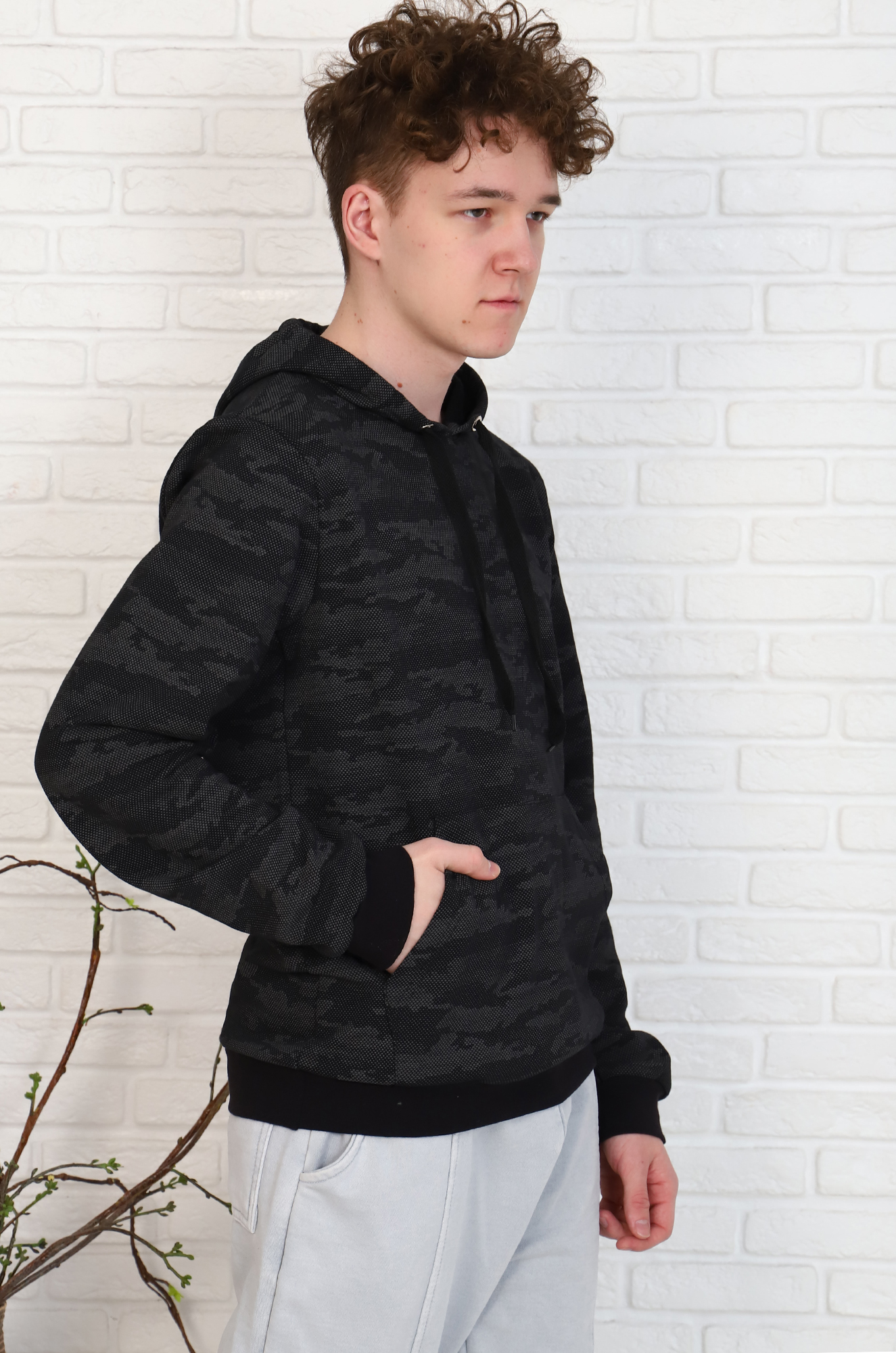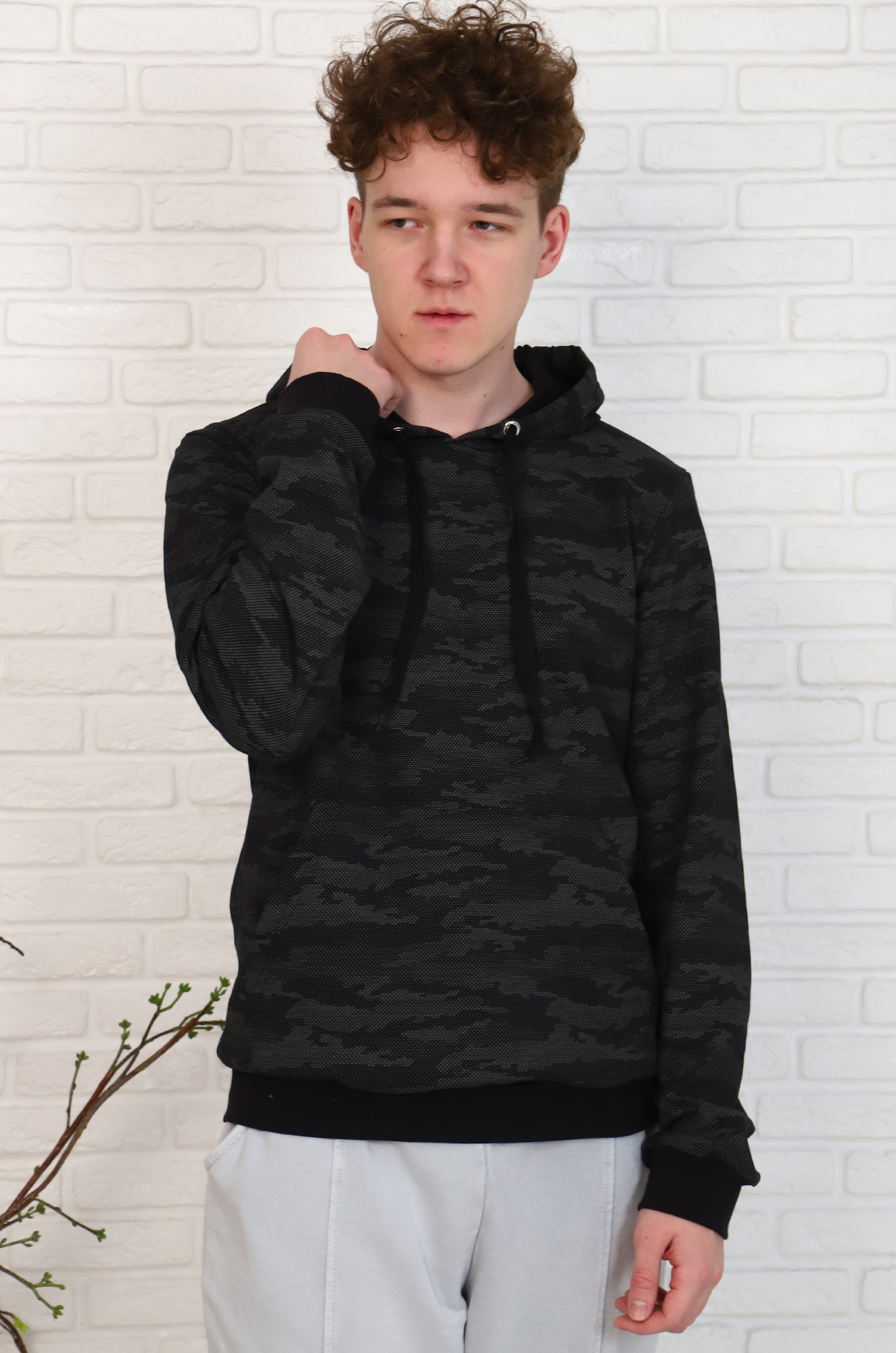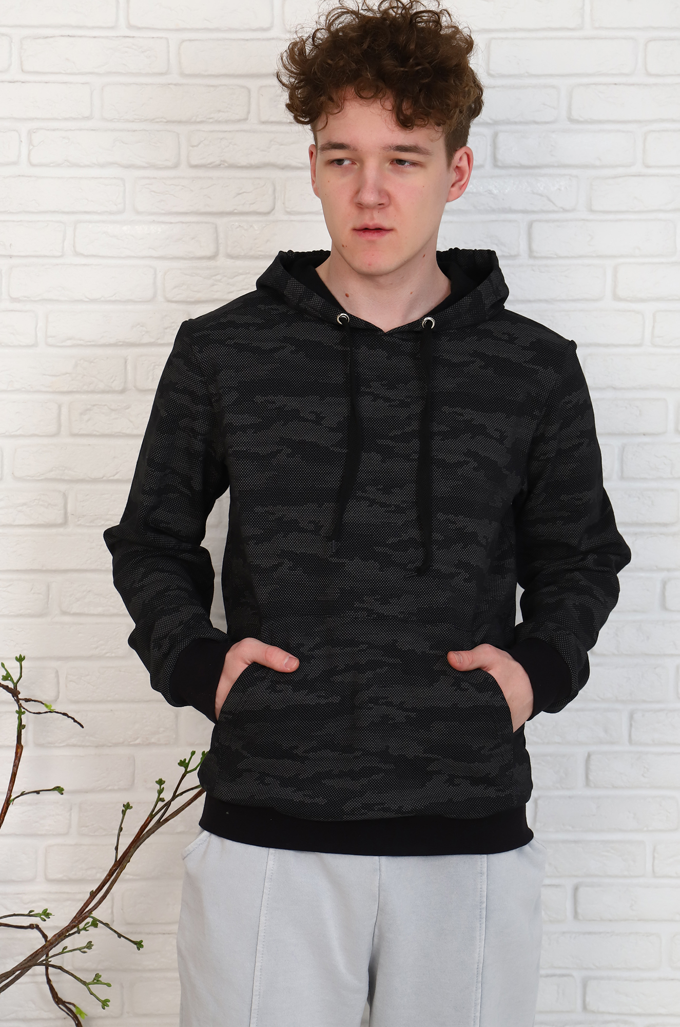 Ткань - футер двухнитка с небольшим начёсом. Приятная к телу и мягкая. Расцветка ткани с набивным эксклюзивным рисунком в стиле "милитари" делает модель интересной и эффектной.