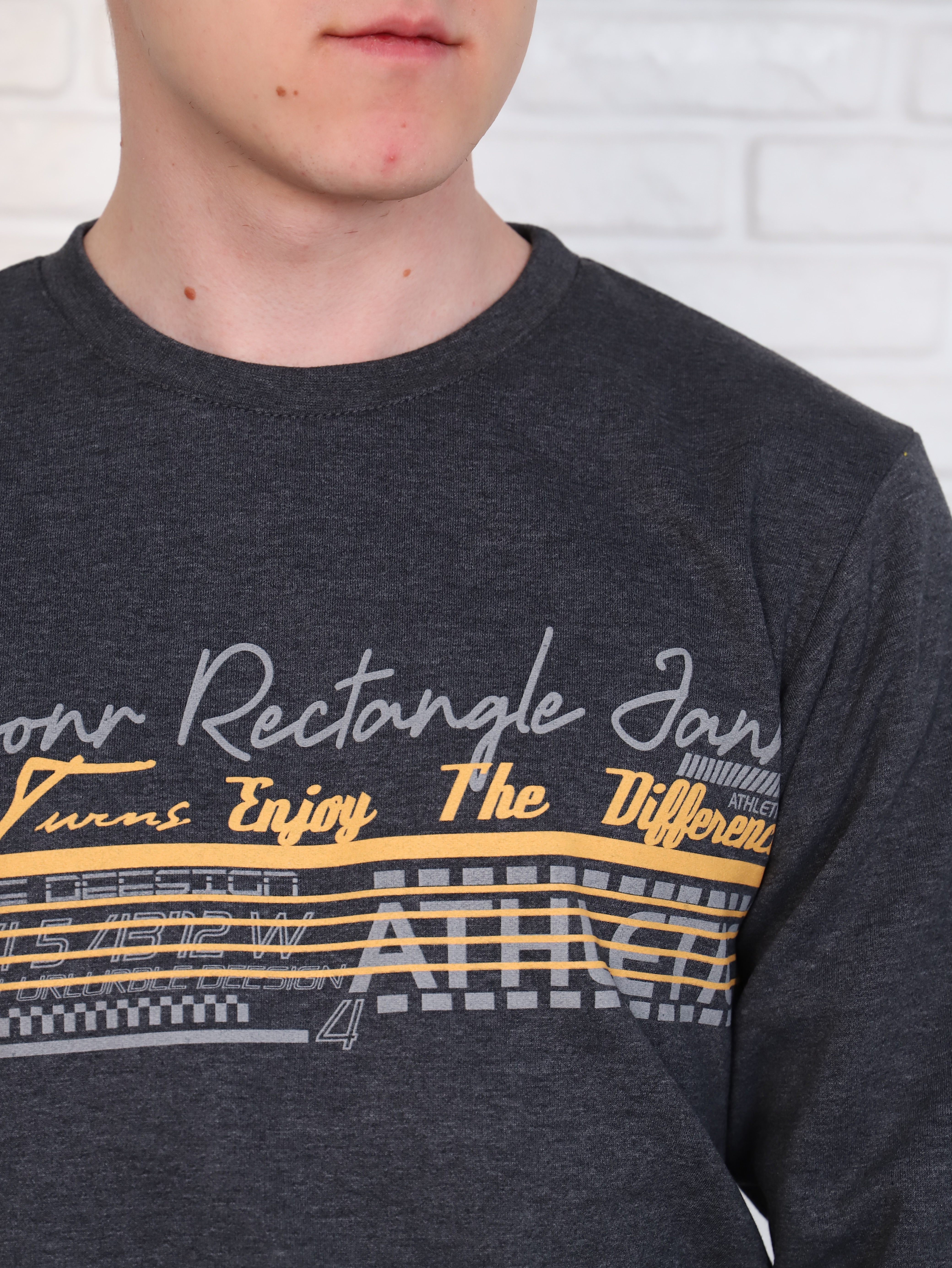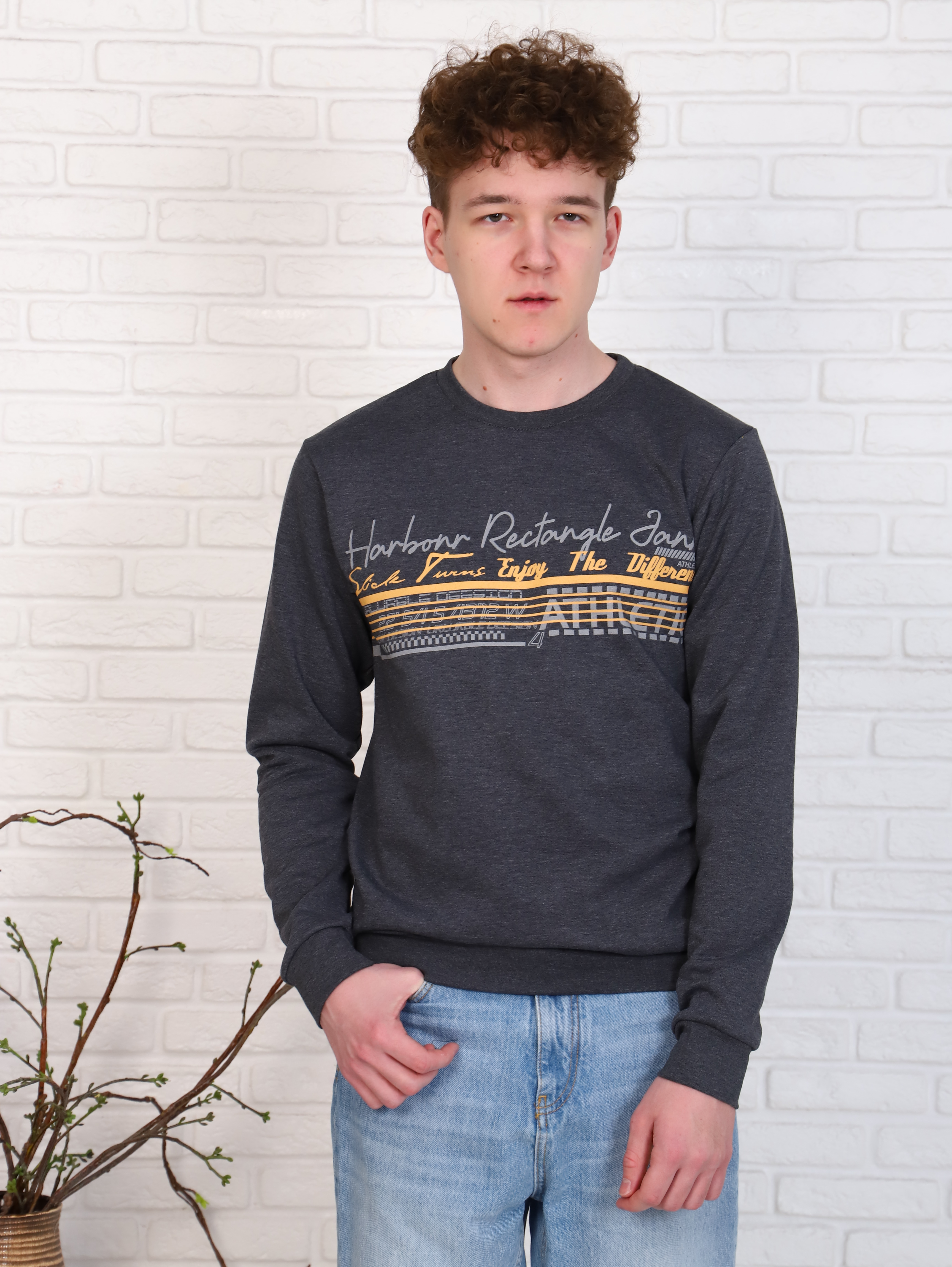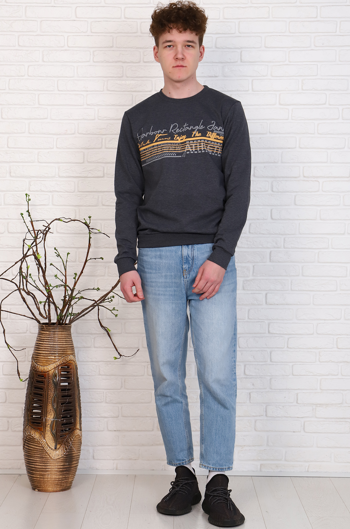 Стильная мужская толстовка-свитшот из облегчённого футера с микроначёсом. Классический округлый вырез горловины, рукава и низ изделия на манжетах, на полочке печатный принт. Модель отлично смотрится и с джинсами, и с классическими брюками. Идеальный вариант на каждый день.