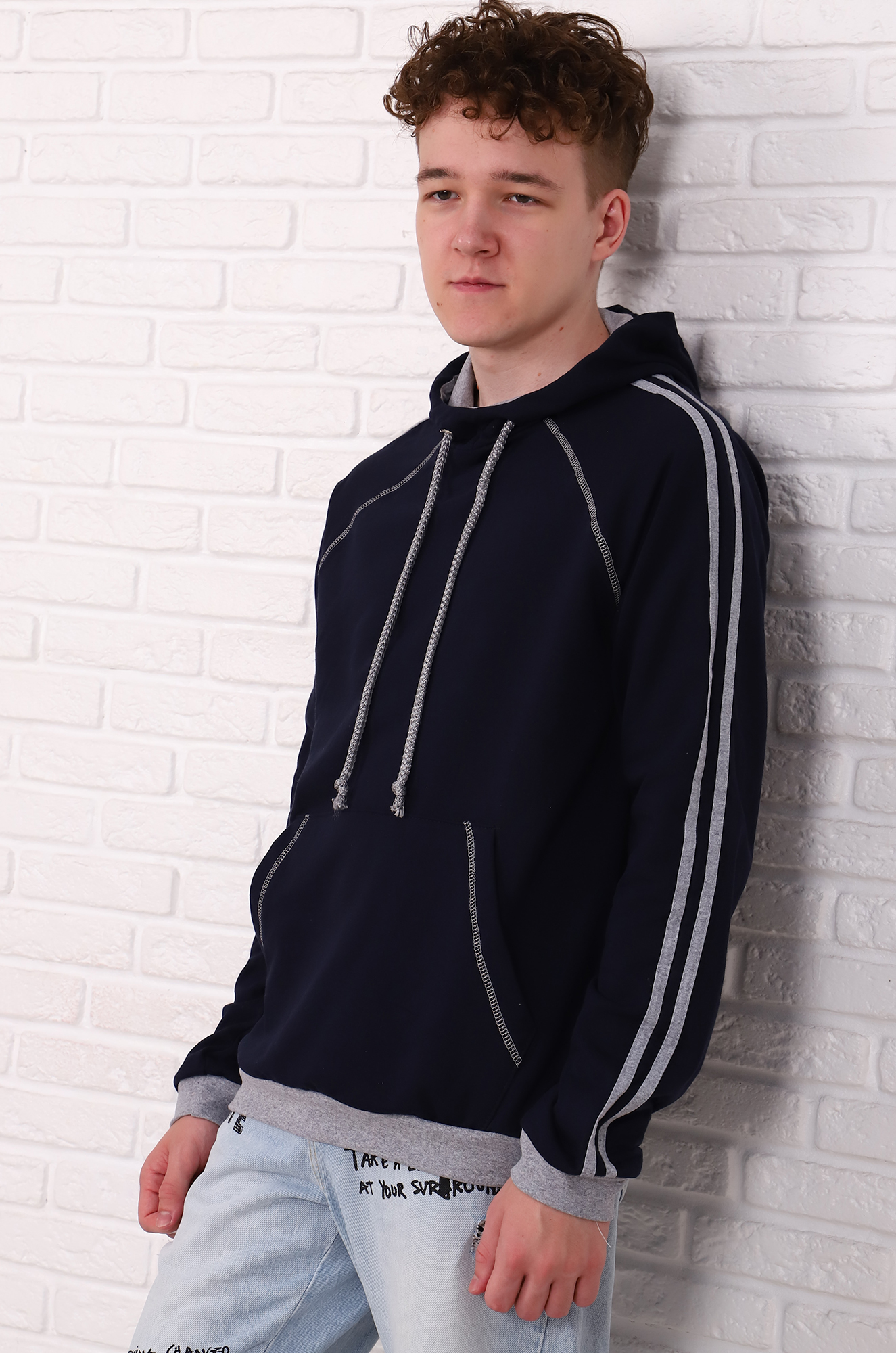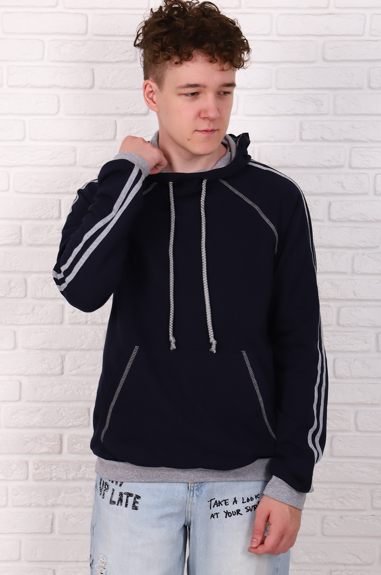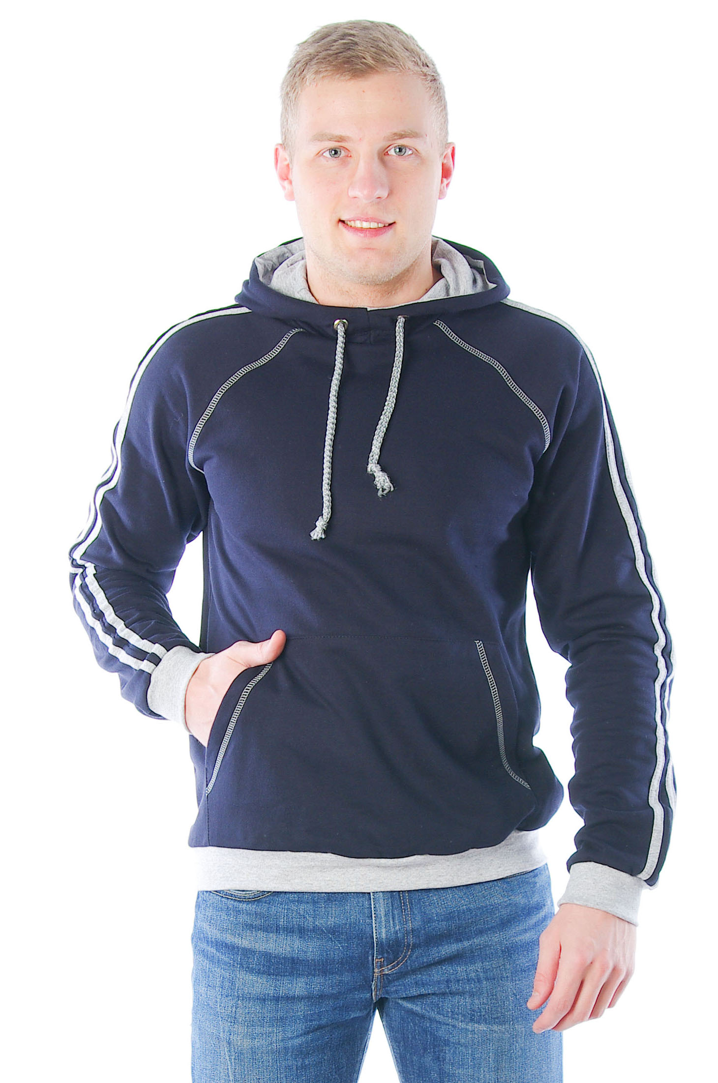 Удобная толстовка в спортивном стиле. Модель с контрастными лампасами на рукавах и карманом - "кенгуру". Двойной капюшон с подкладкой из кулирного полотна защитит от непогоды. Манжеты из эластичной рибаны, рукав - реглан.