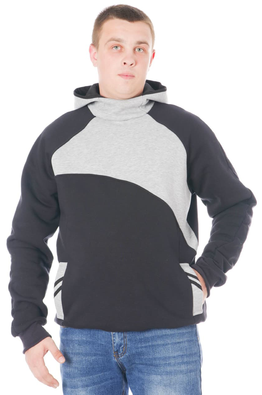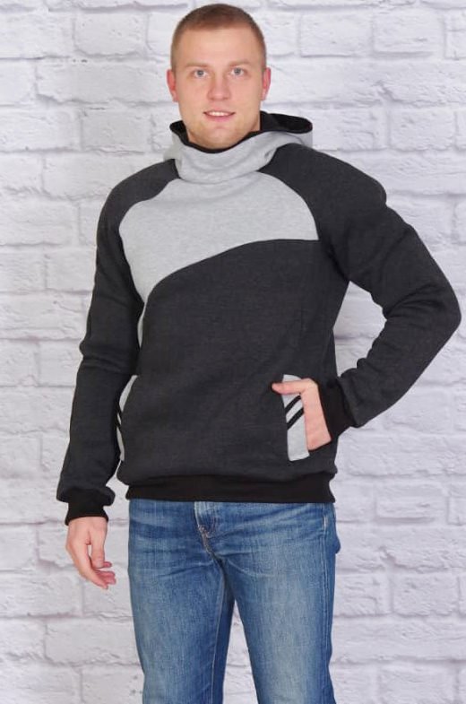 Теплая спортивная толстовка на манжете сложного кроя с отрезными детяли, удобные боковые карманы, рукав реглан. Капюшон с подкладкой из кулирки и с высокой "стойкой" хорошо защищает от ветра. Для манжетов и отделки используется эластичная рибана. Ткань супер-футер, плотность 320-350 г/м2. Модель хорошо подходит на каждый день к спортивным брюкам и джинсам.