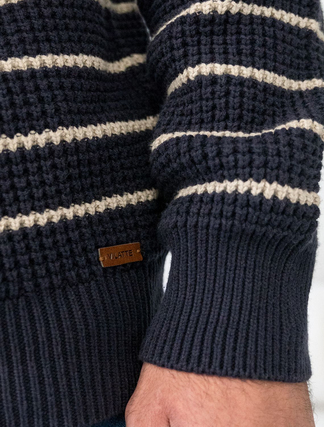 Свитер с узором полосы выполнен из хлопковой пряжи с добавлением акрила. Теплая модель фактурной крупной вязки с воротом, застегивается металлической молнией. Регулируя ворот можно носить с рубашками, футболками и водолазками. Кроме того, свитер совершенно не колется, поэтому его комфортно носить даже на голое тело. Внизу изделия нашивка бренда из эко-кожи.